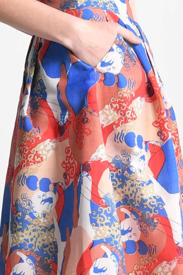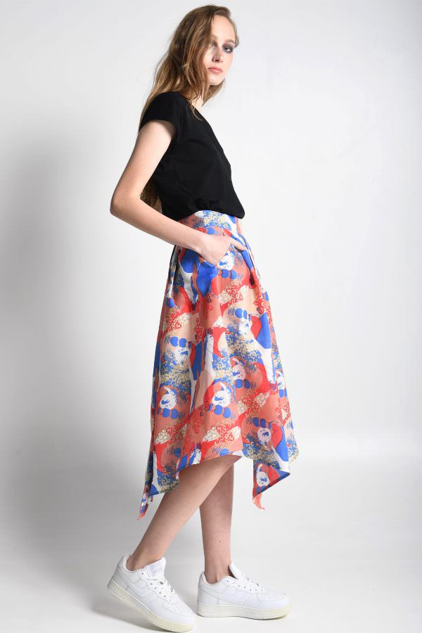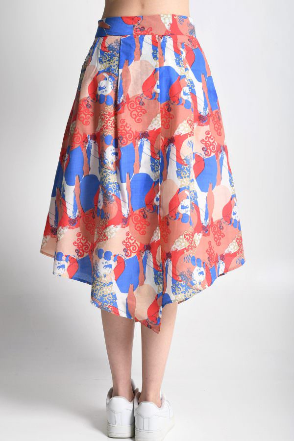 Asymmetric pleated print skirt in cotton voile with side pockets and side zip closing.
