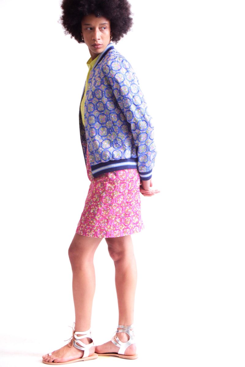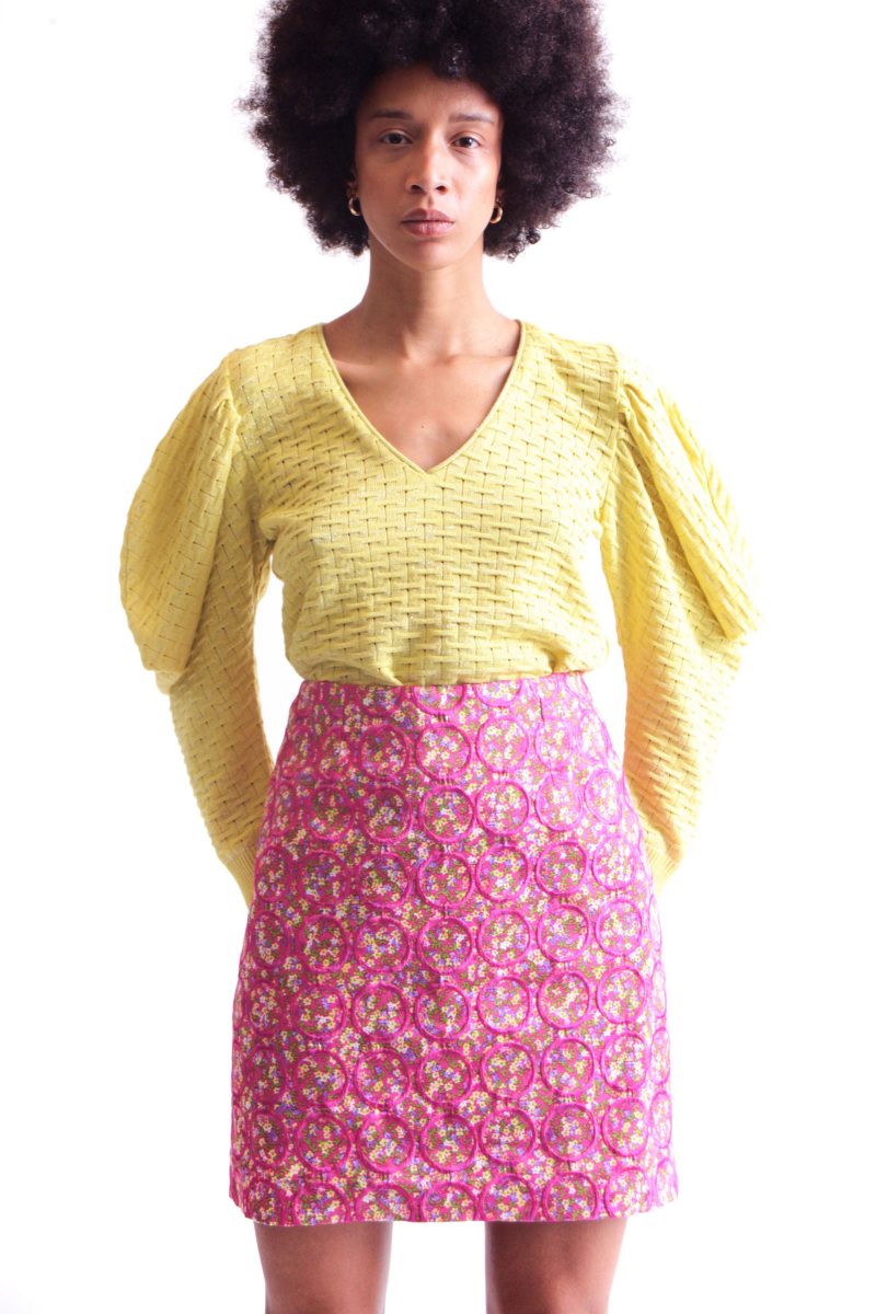 Fully embroidered floral mini skirt fitted with darts and fully lined.