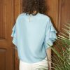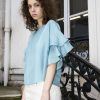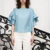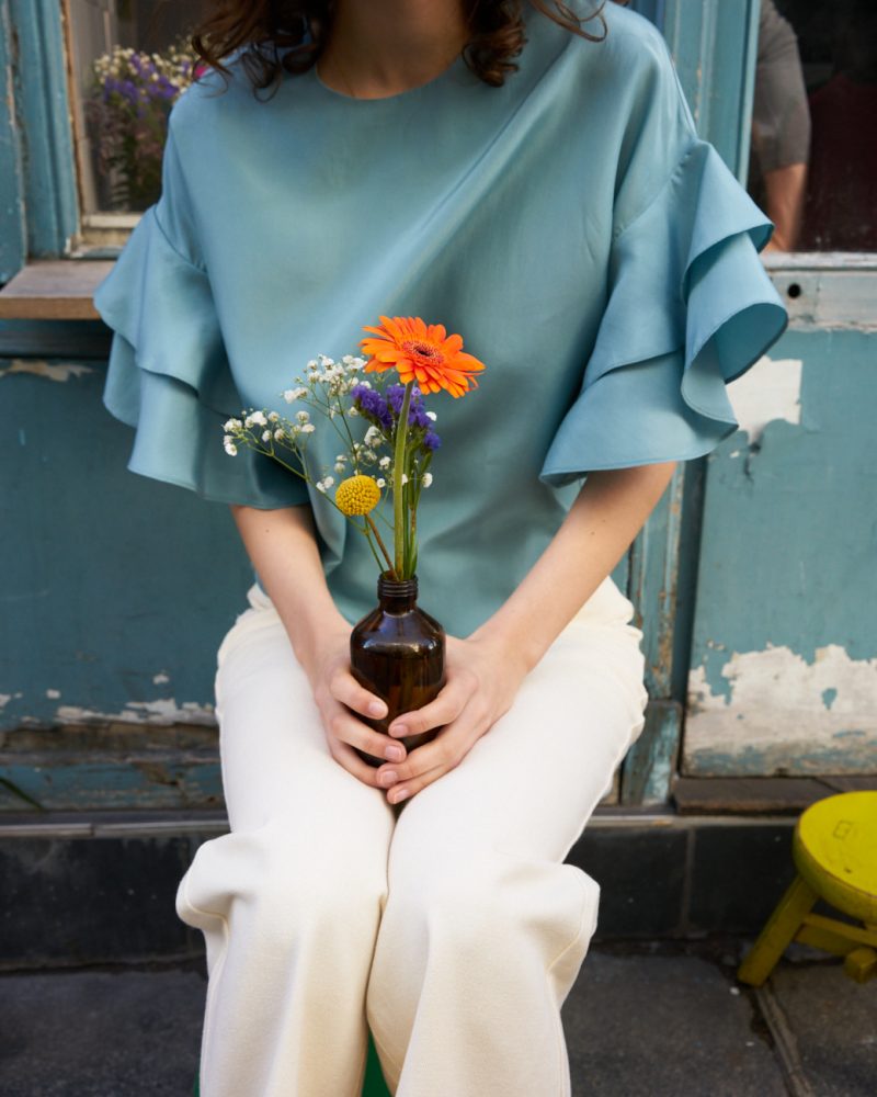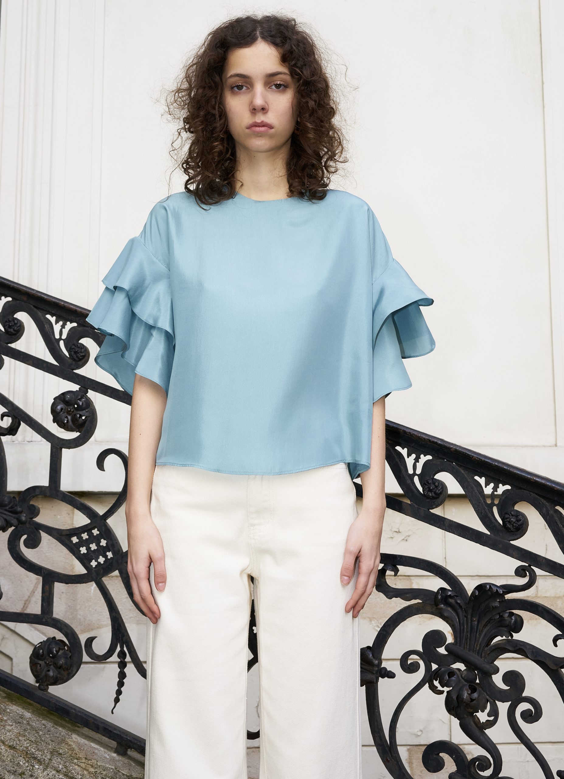 Fluid and boxy ruffle sleeve top made out of luxurious silk crepe.