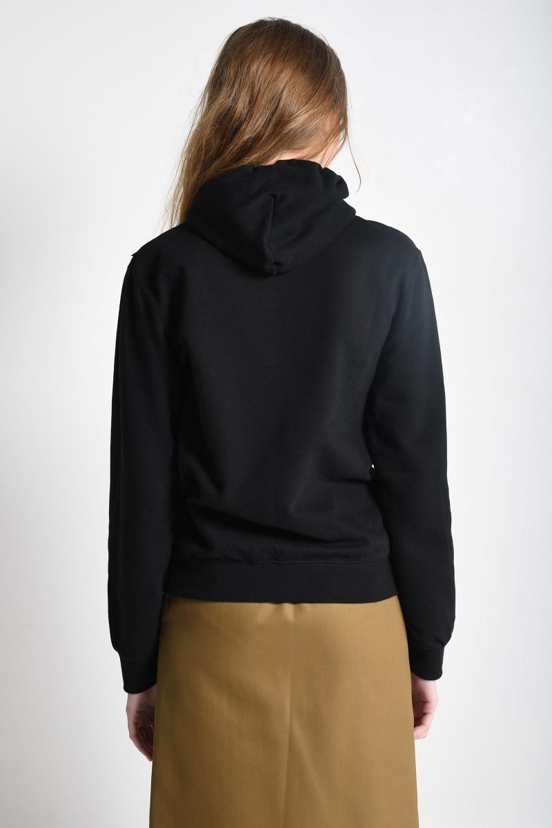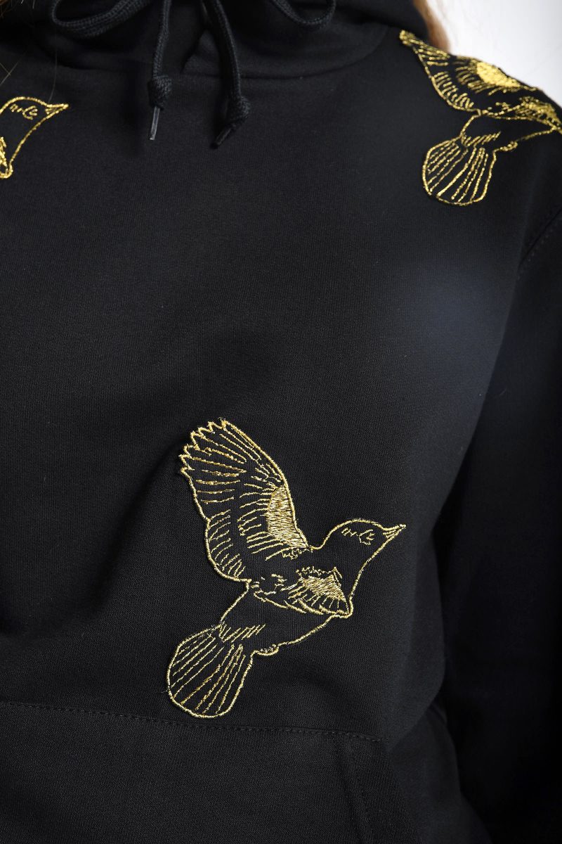 Sweat à capuche, broderies oiseaux en fil doré, poche manchon, possibilité d’ajuster la capuche par les liens de serrage, finition bords côtes au niveau des poignets et du bas.