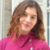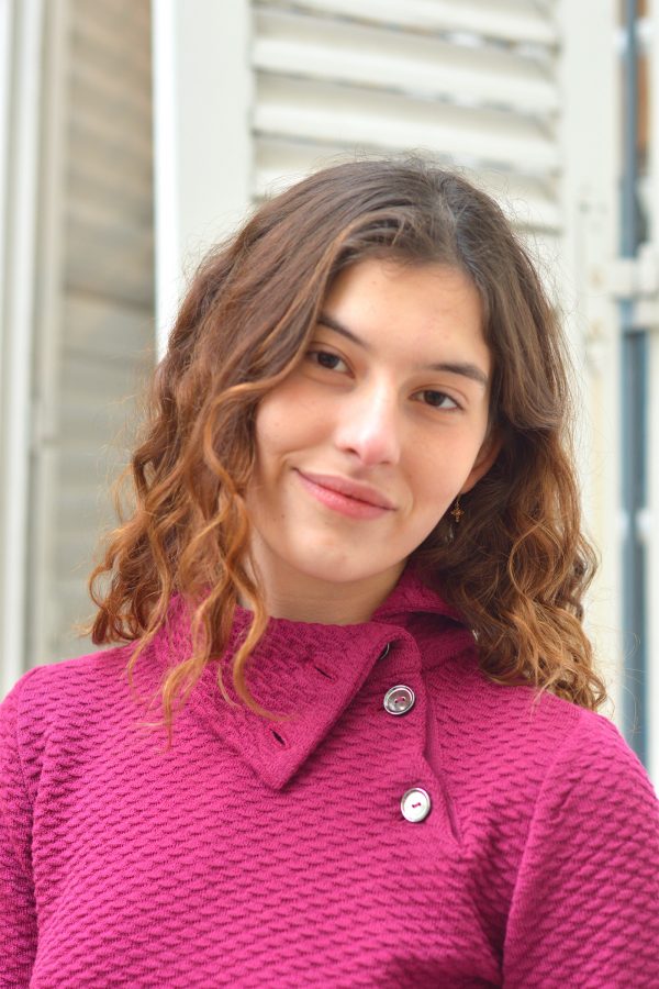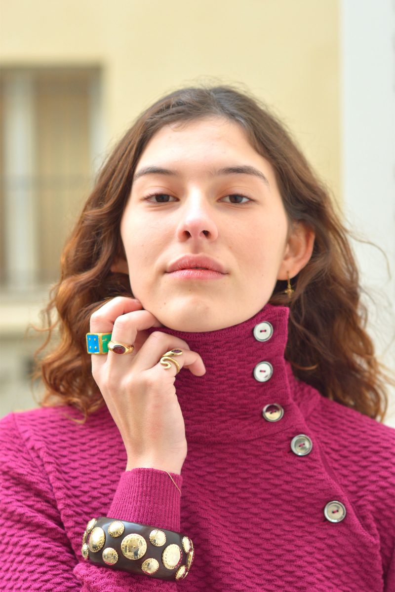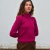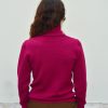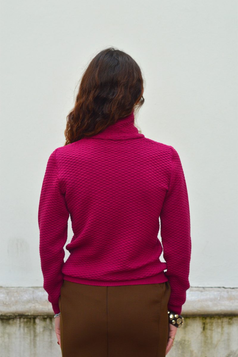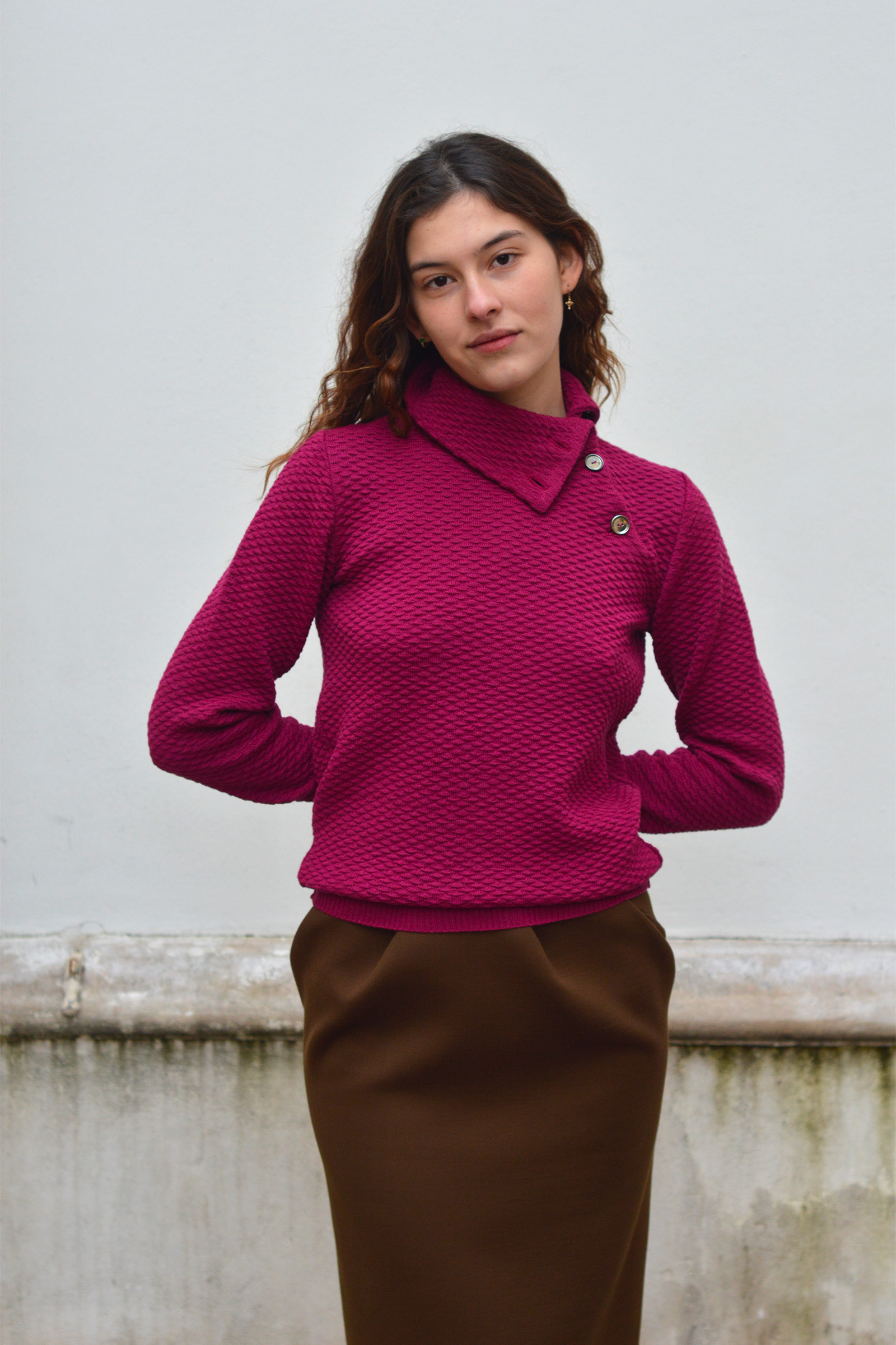 Raspberry textured knit sweater with adjustable turtleneck in wool and cotton blend.