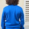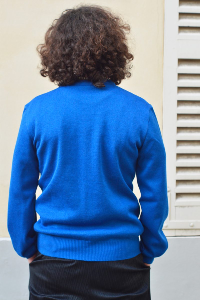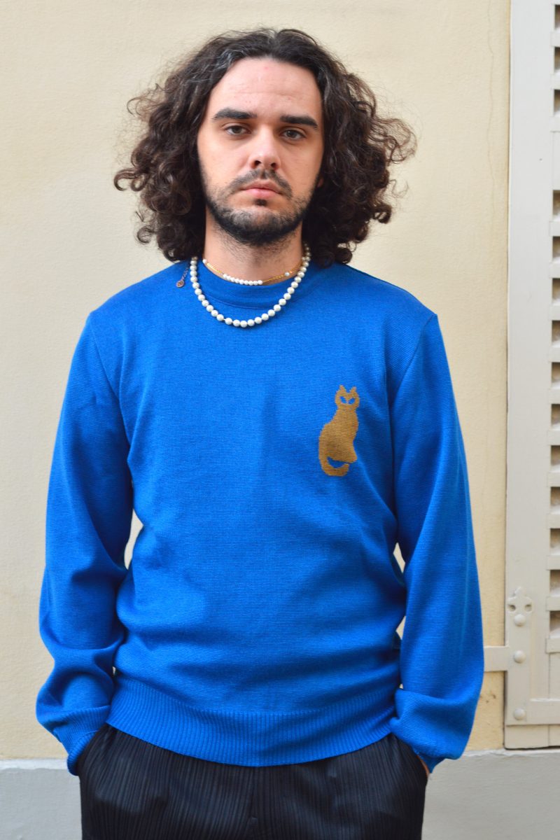 Zion sweater made in cotton merino blend. The sweater has a straight fit and a round collar. Cat pattern on the right side.