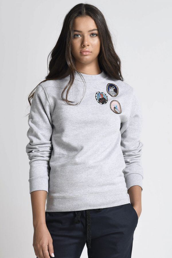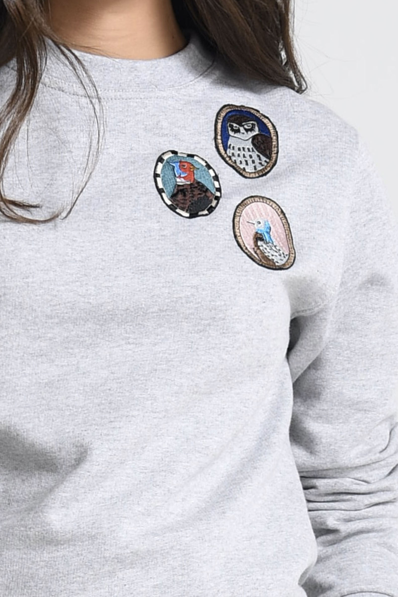 Round neck cotton sweatshirt with embroidered bird head cameos. The style is gender fluid with a relaxed fit.