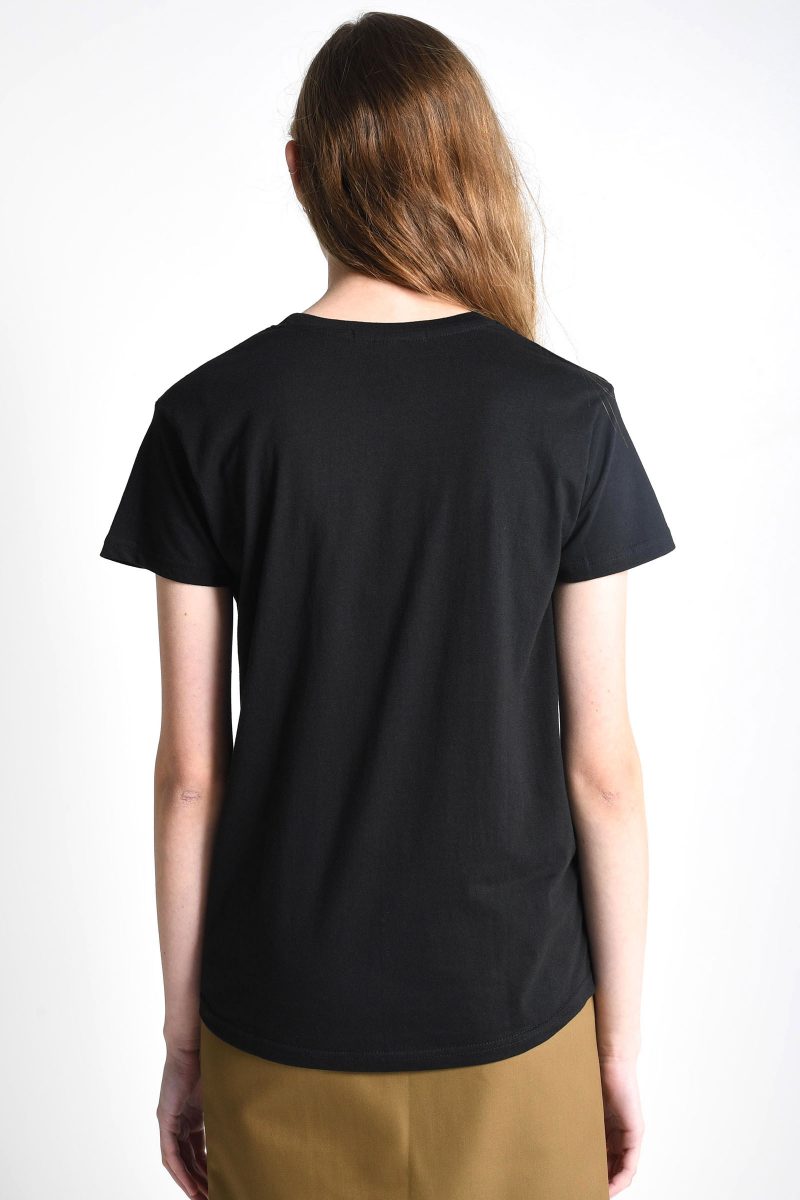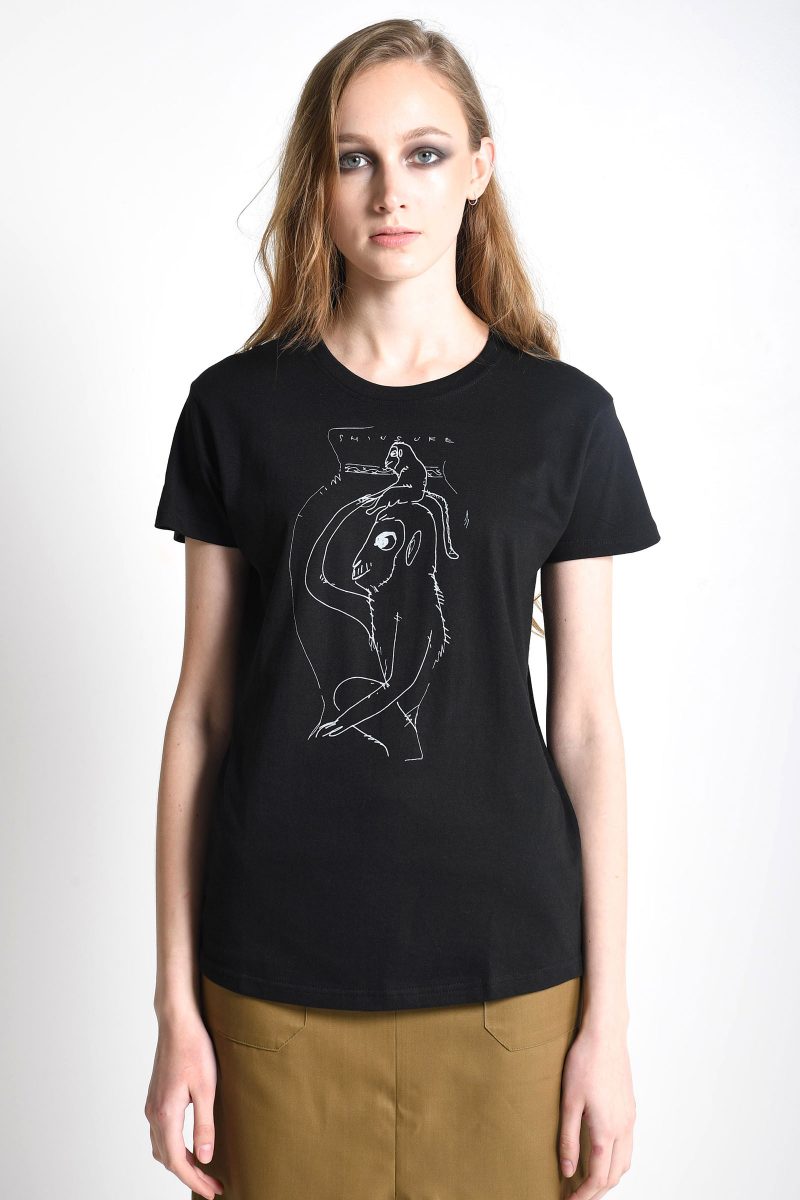 T-Shirt en coton noir, col rond, manches courtes, imprimé blanc singes.