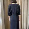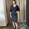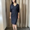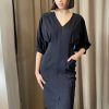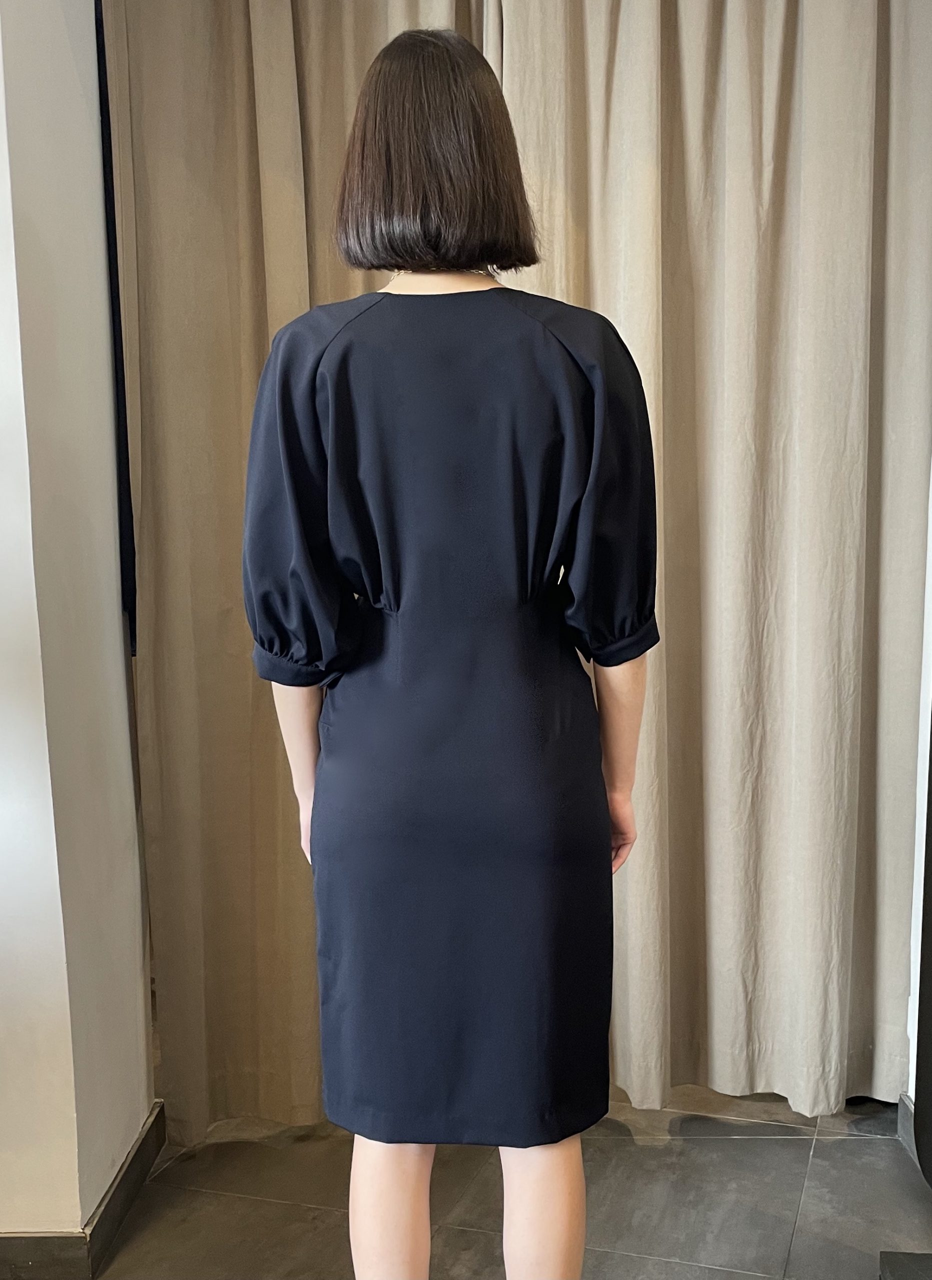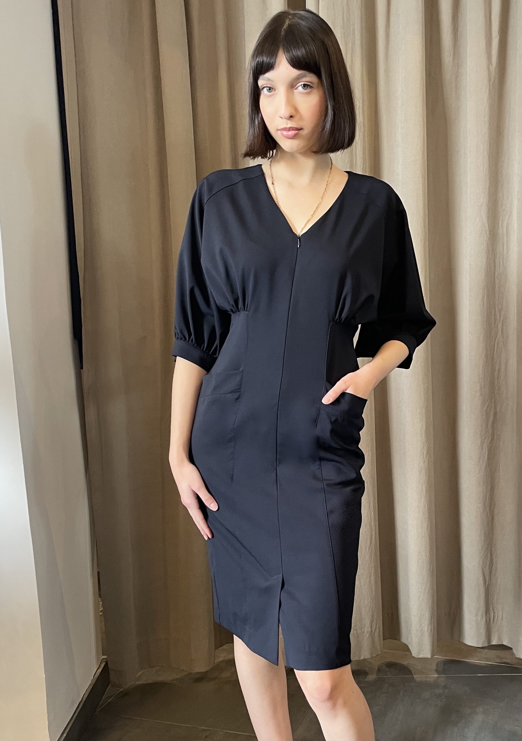 A meticulously structured dress cut from fluid stretch night blue cool wool, featuring a clean V-neckline that elongates the silhouette. Expert construction and raglan sleeves sculpt the shoulders, while architectural seam lines shape the body with precision. Discreet side pockets add effortless practicality.