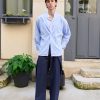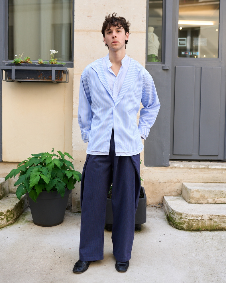 A bold reinterpretation of the classic shirt, this oversized piece features a refined mandarin collar and a unique layered construction. The front and sleeves are doubled with a second shirt panel, creating a sculptural, dimensional effect, while the back remains unlayered for a softer drape. Long drawstrings add versatility, allowing the shirt to be styled in multiple ways—cinched, draped, or left loose—for a personalized silhouette that transitions seamlessly from effortless to editorial.