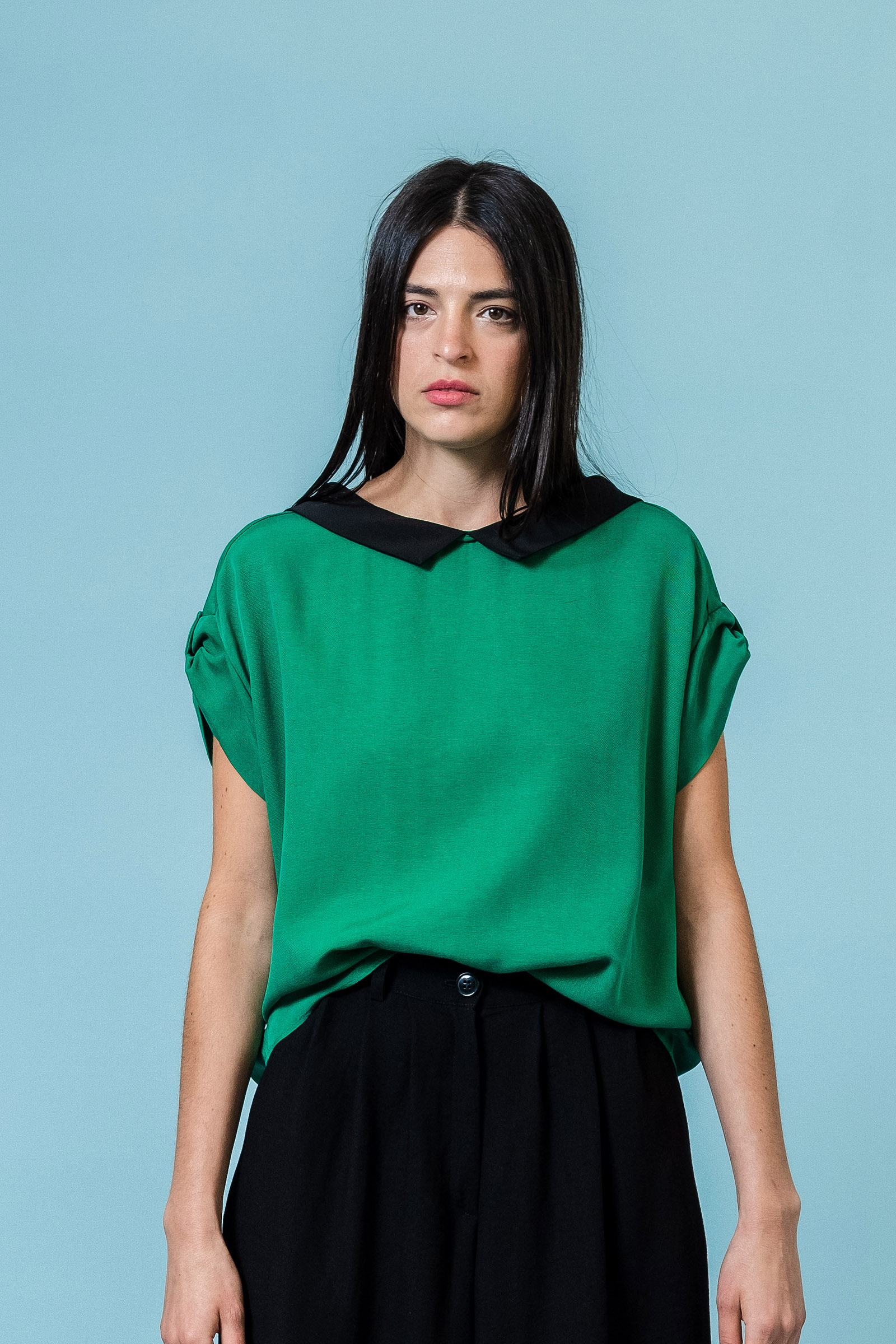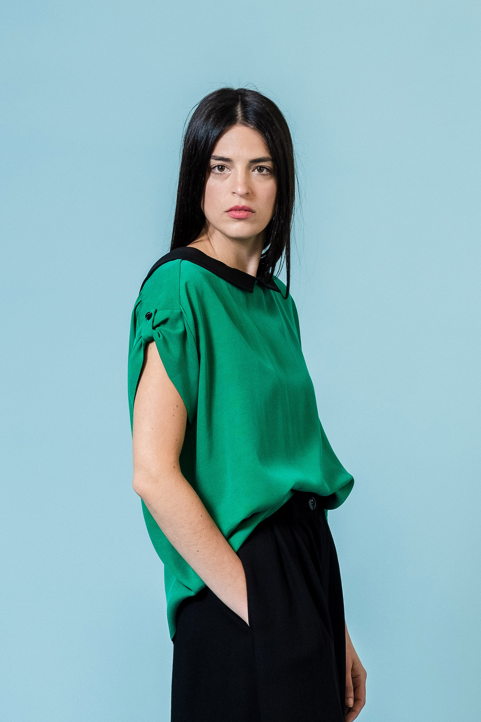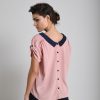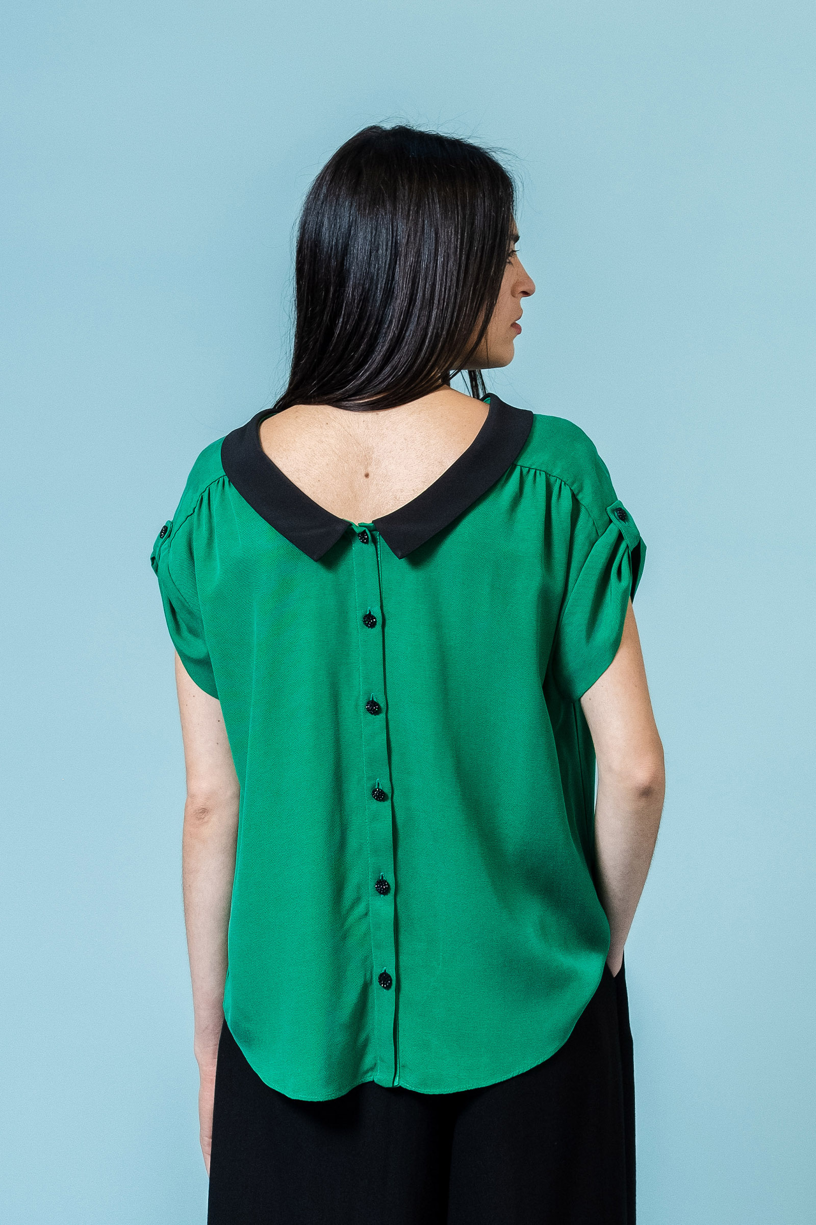 Haut ample à col Claudine avec fermeture par boutons en verre et manches tombantes ajustable.