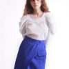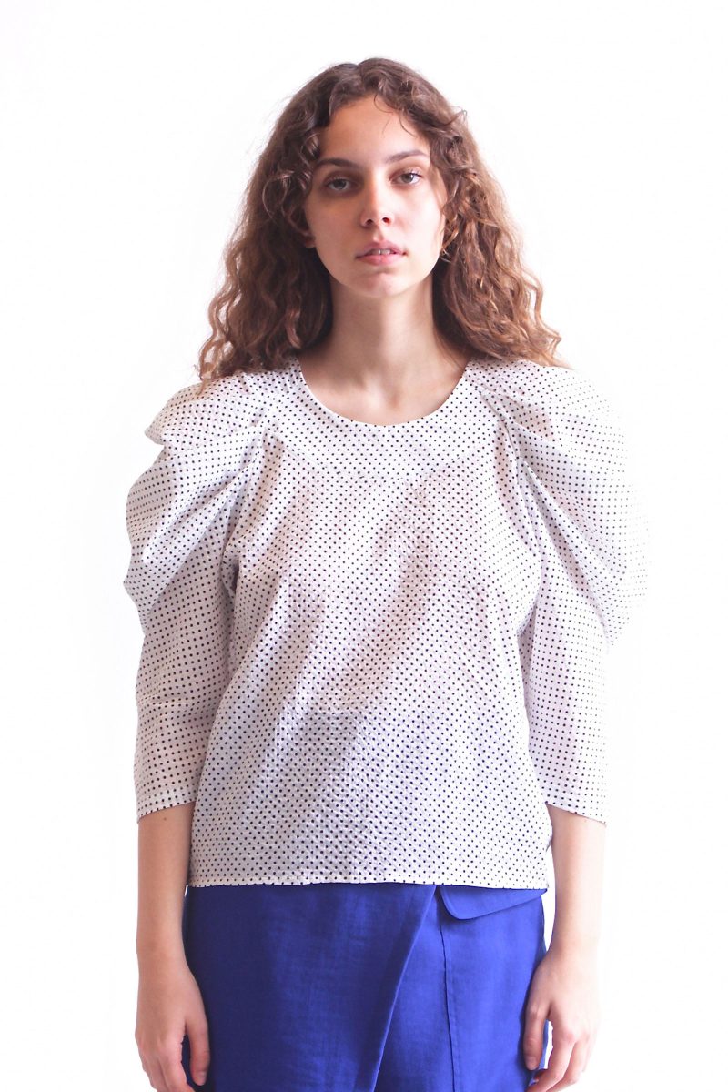 Top col rond en seersucker de coton motif petit pois. Il possède des manches bouffantes à plis coupe raglan.