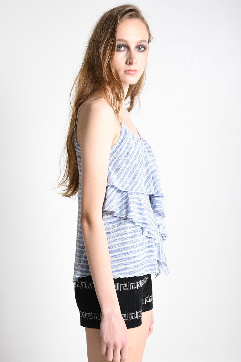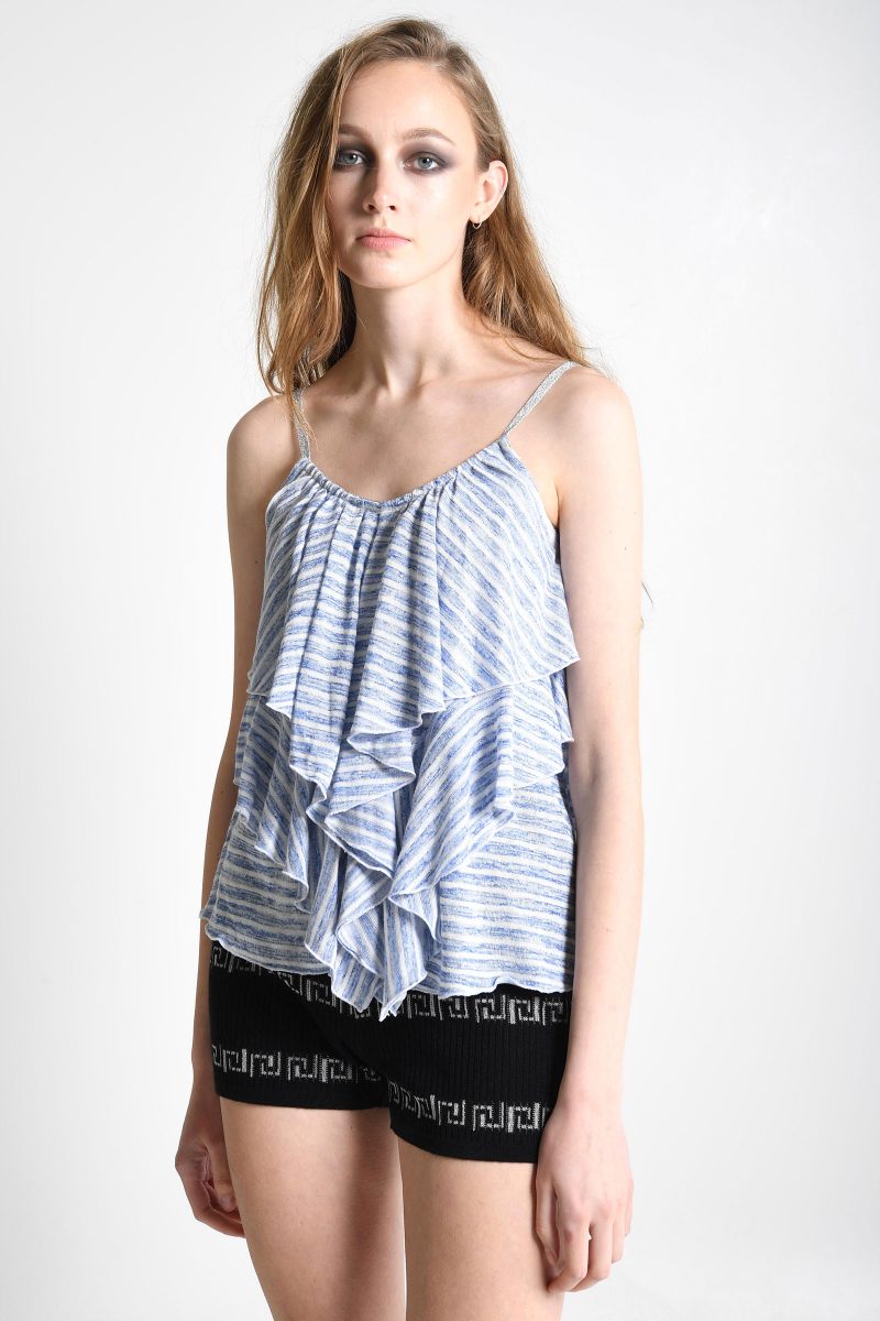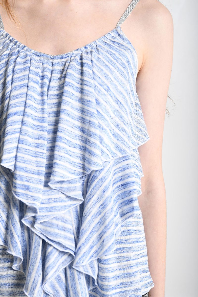 Top chiné à mancherons, col pétale appliqué dans la même matière broderie argent métallisé.