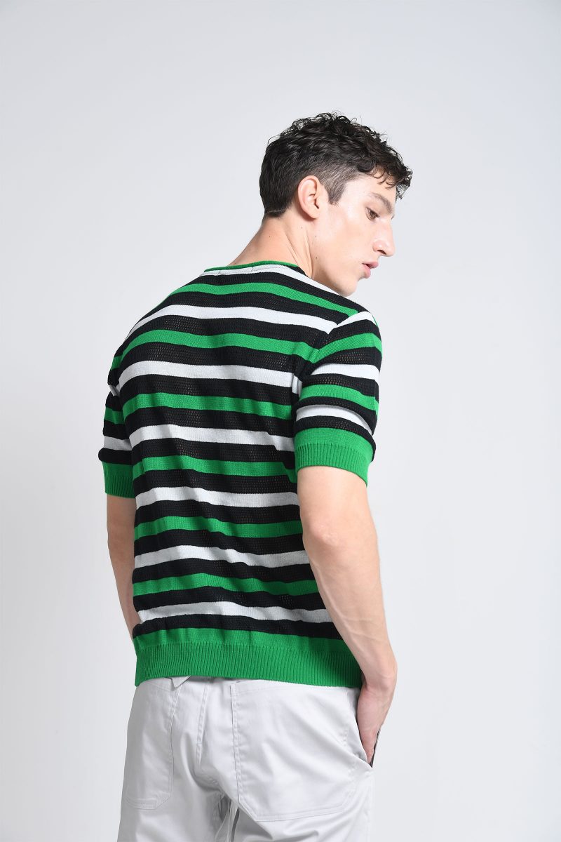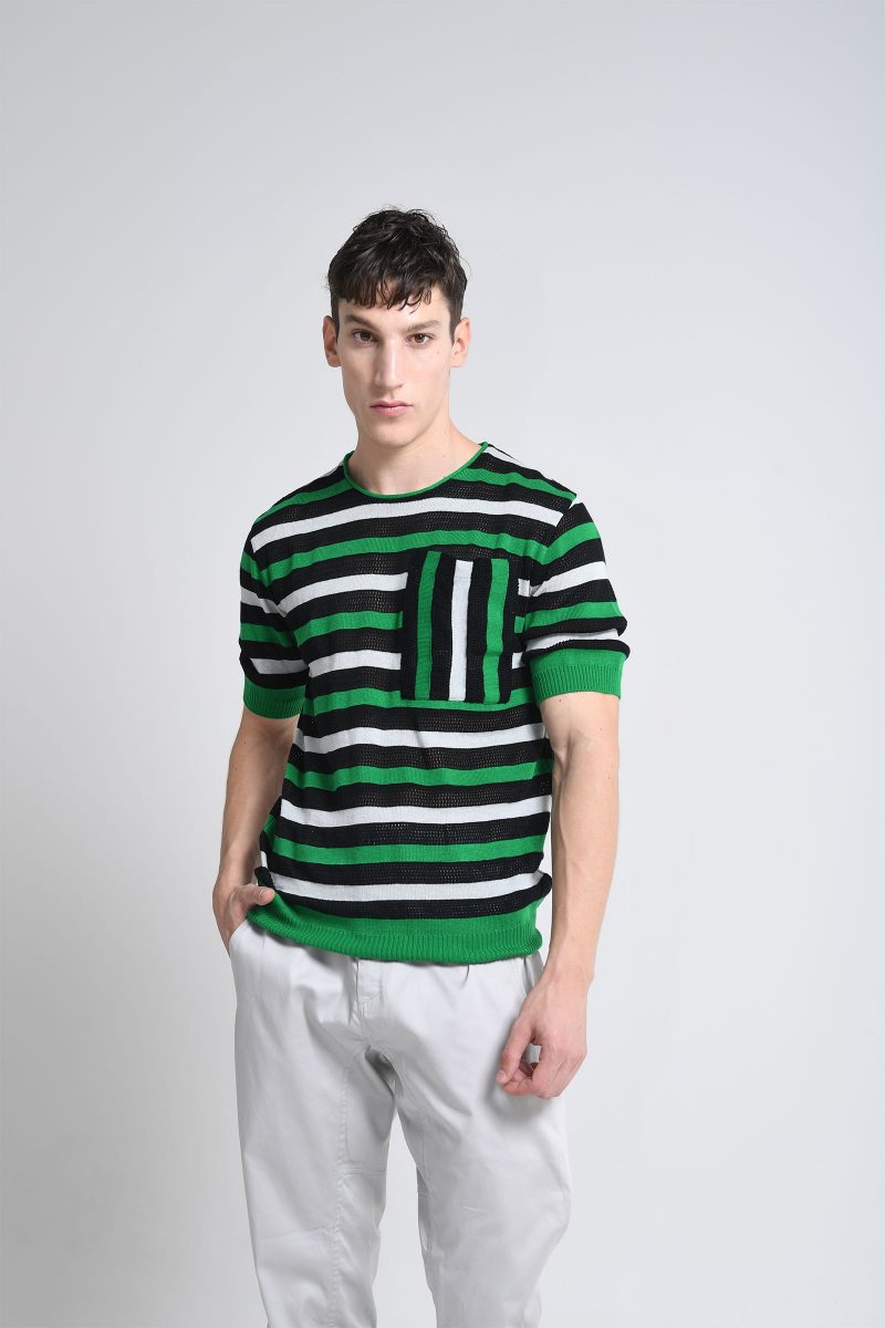 Top avec jeu de rayures en maille ajourƩe et opaque, grande poche plaquƩe.
