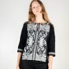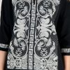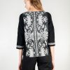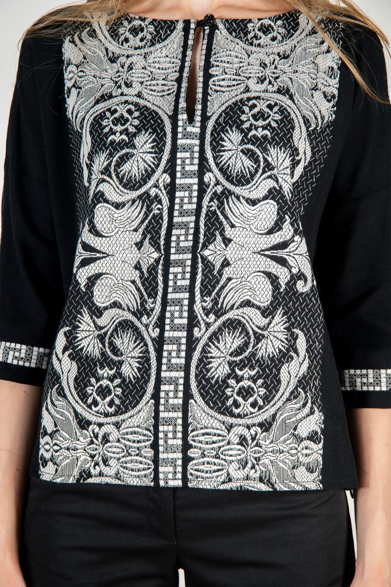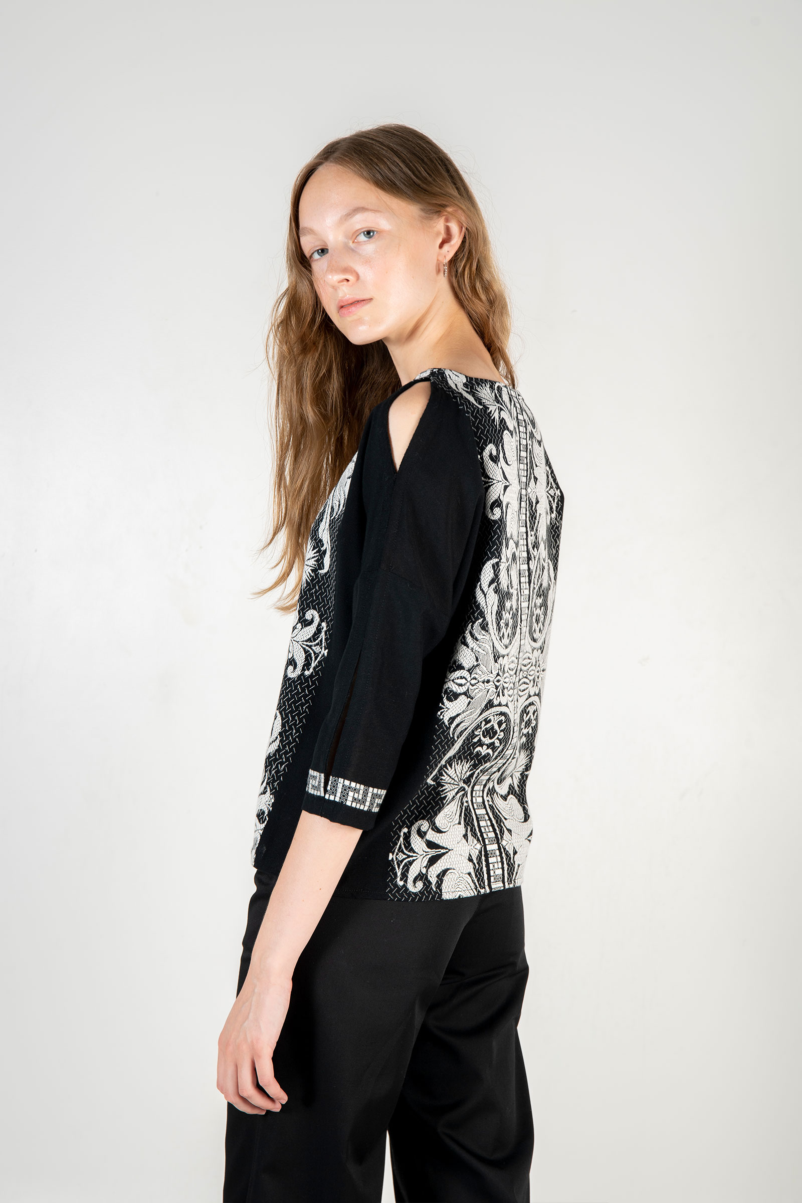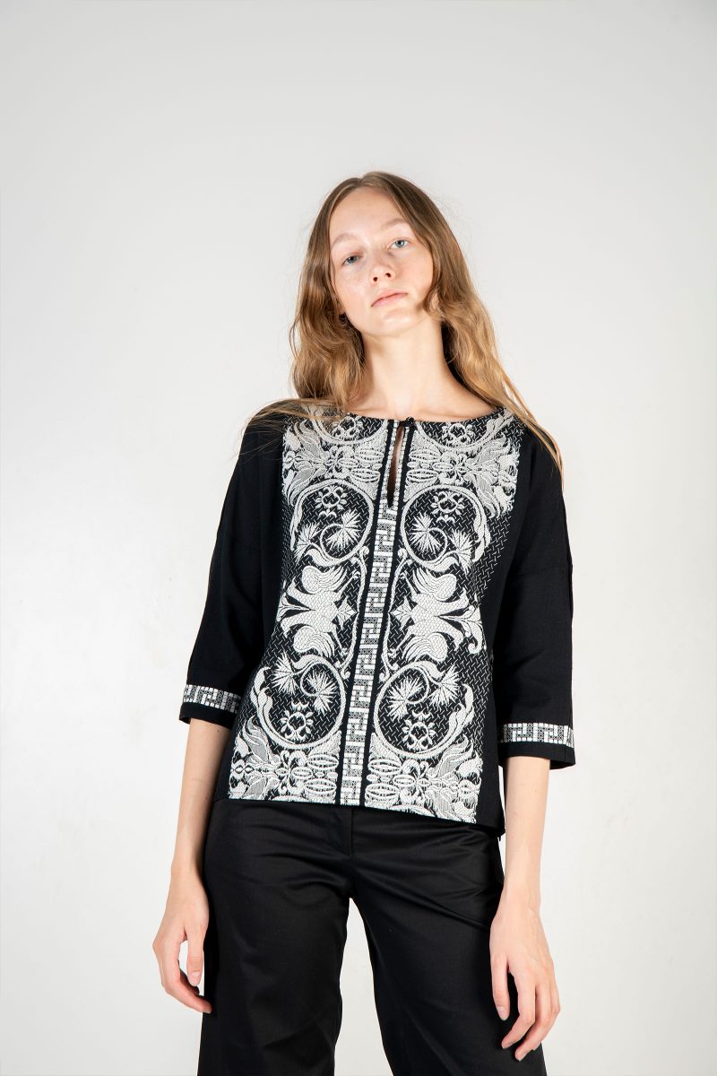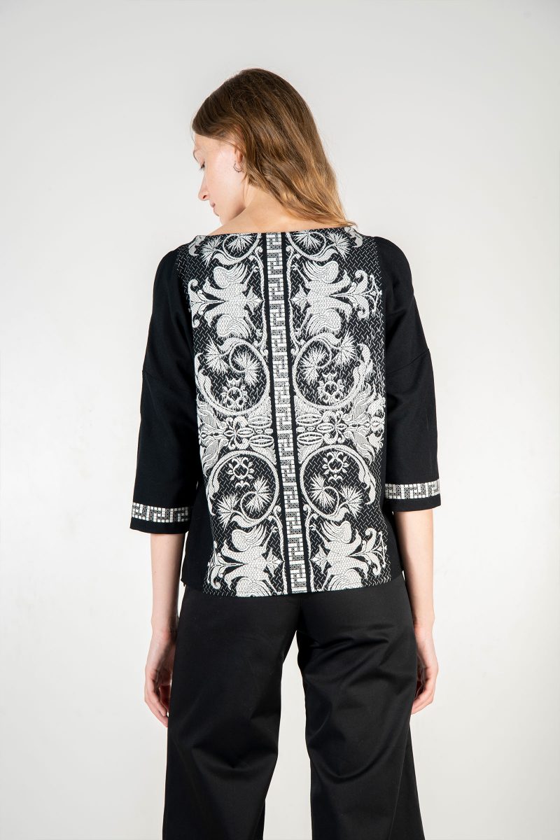 Top with sleeve decoratifs slits in cotton embroidered with grreek traditional pattern. Neckline opens with a slit and button and side with invisible zip.