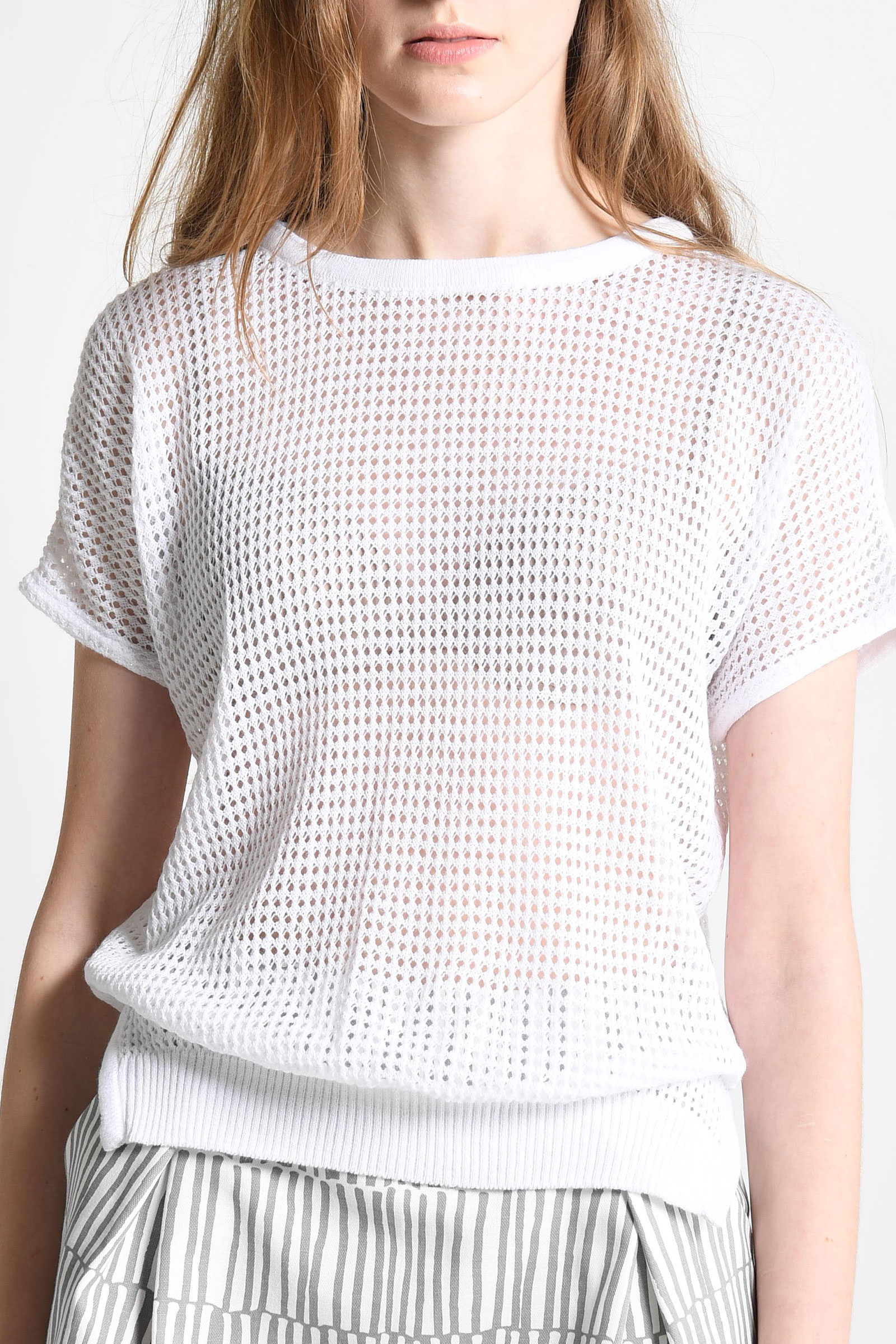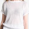 Haut à mancherons en maille point résille irisé, col rond, fermeture goutte d’eau arrière réglable avec cordon de même matière.