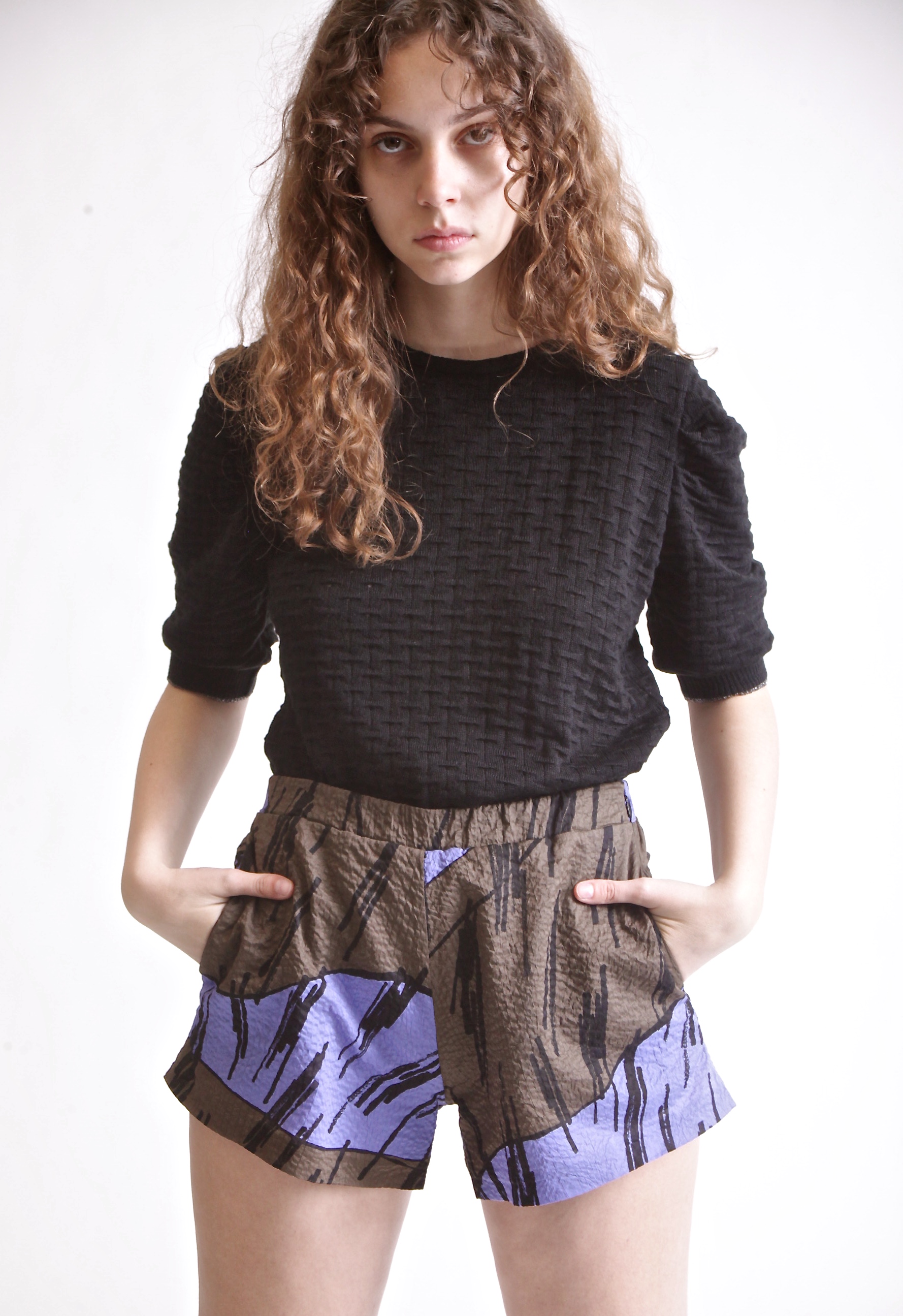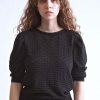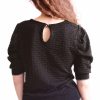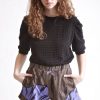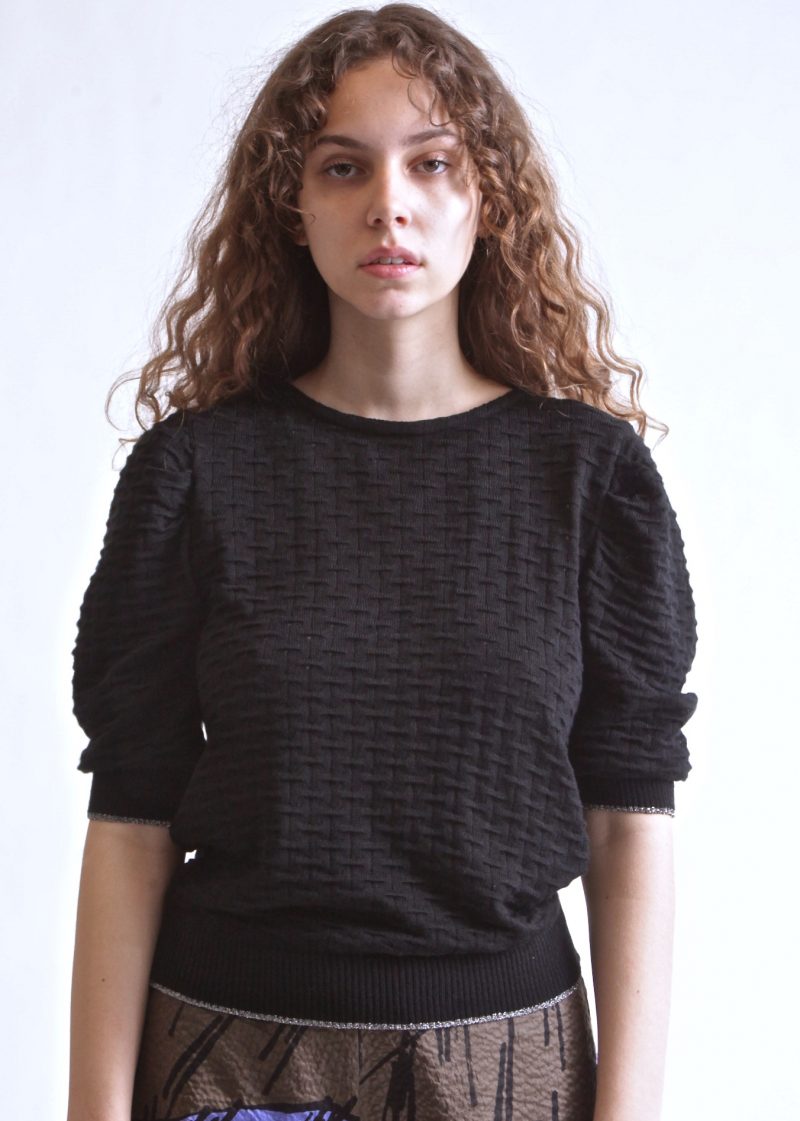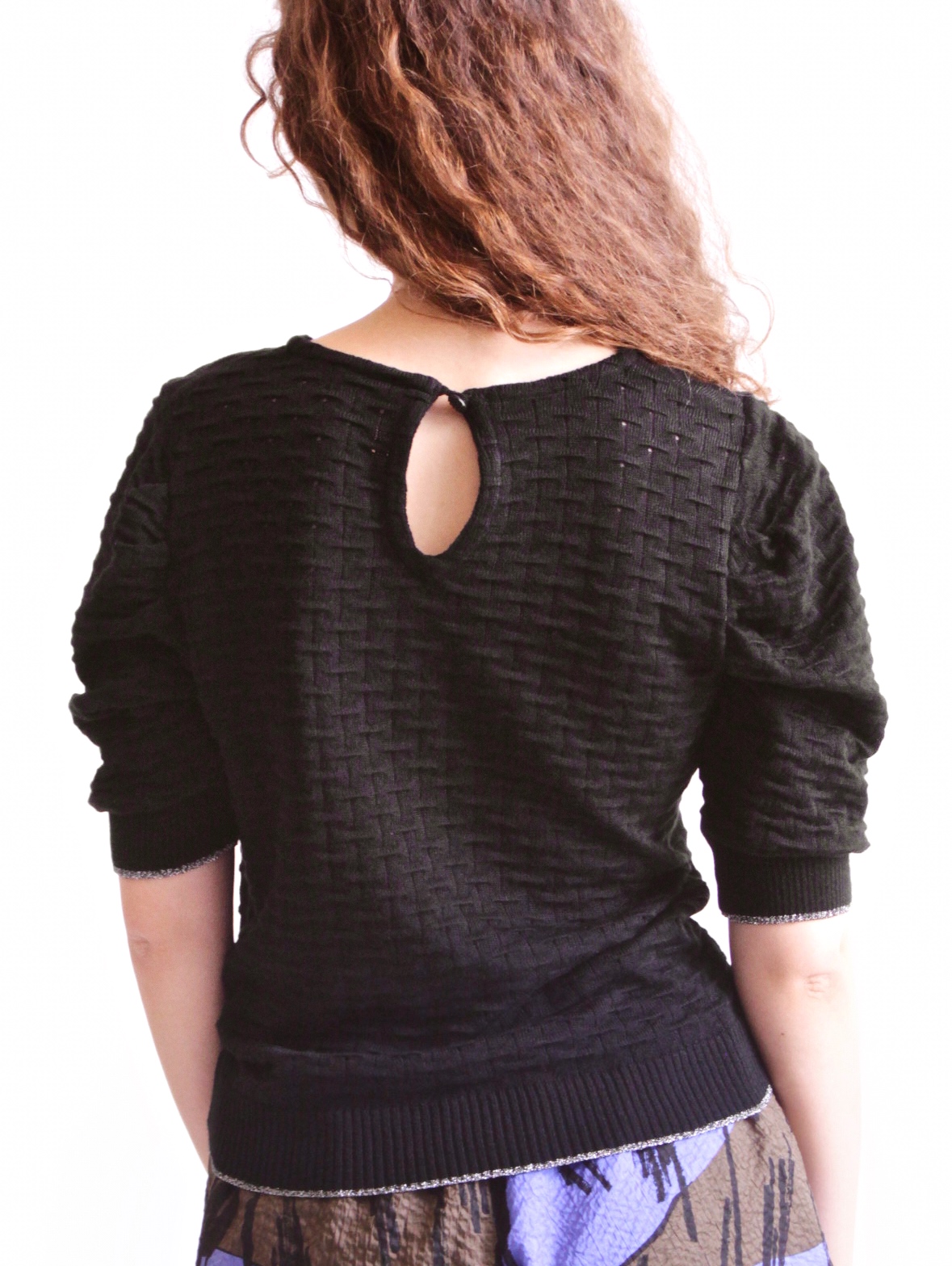 Textured knit sweater with lurex trimmings and pleated sleeves to give a puff effect. It has tear drop closing at the back.