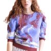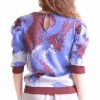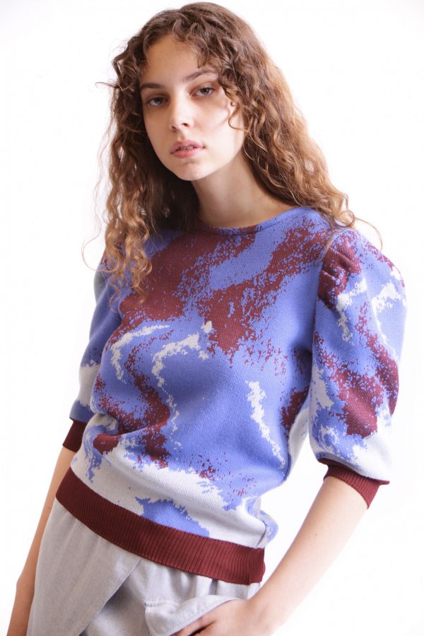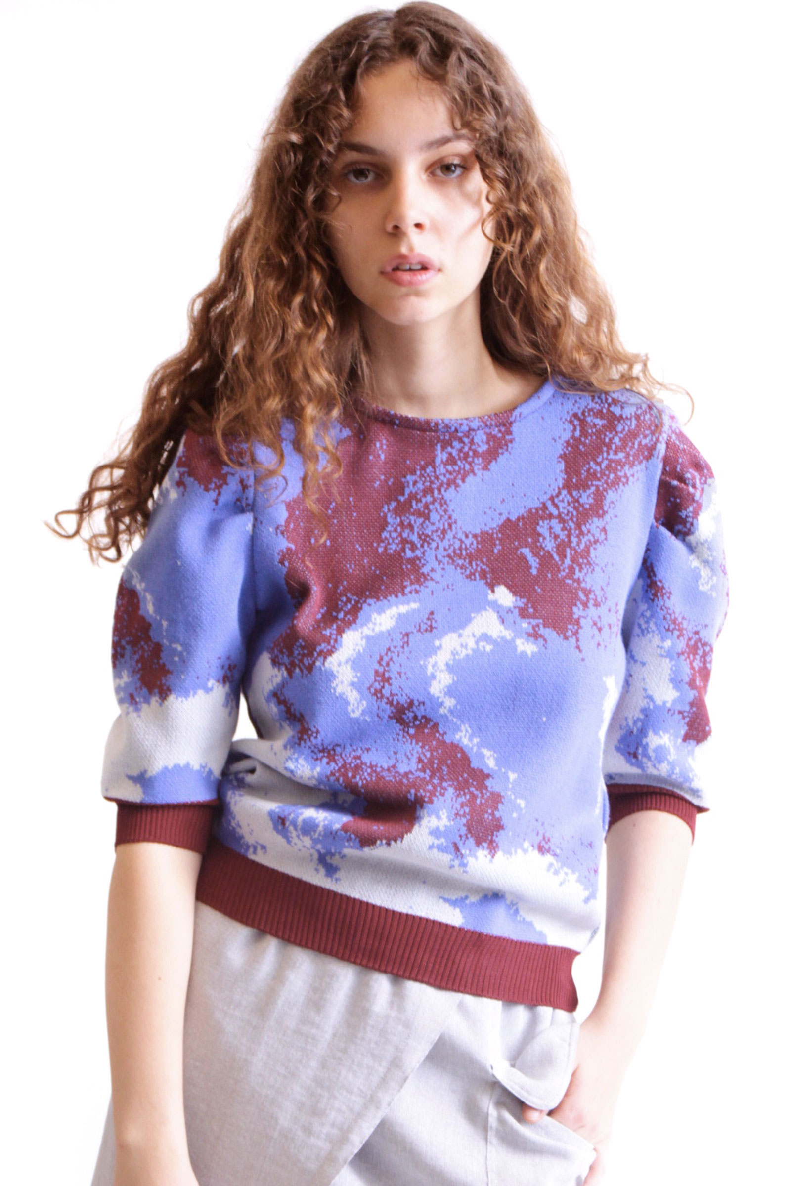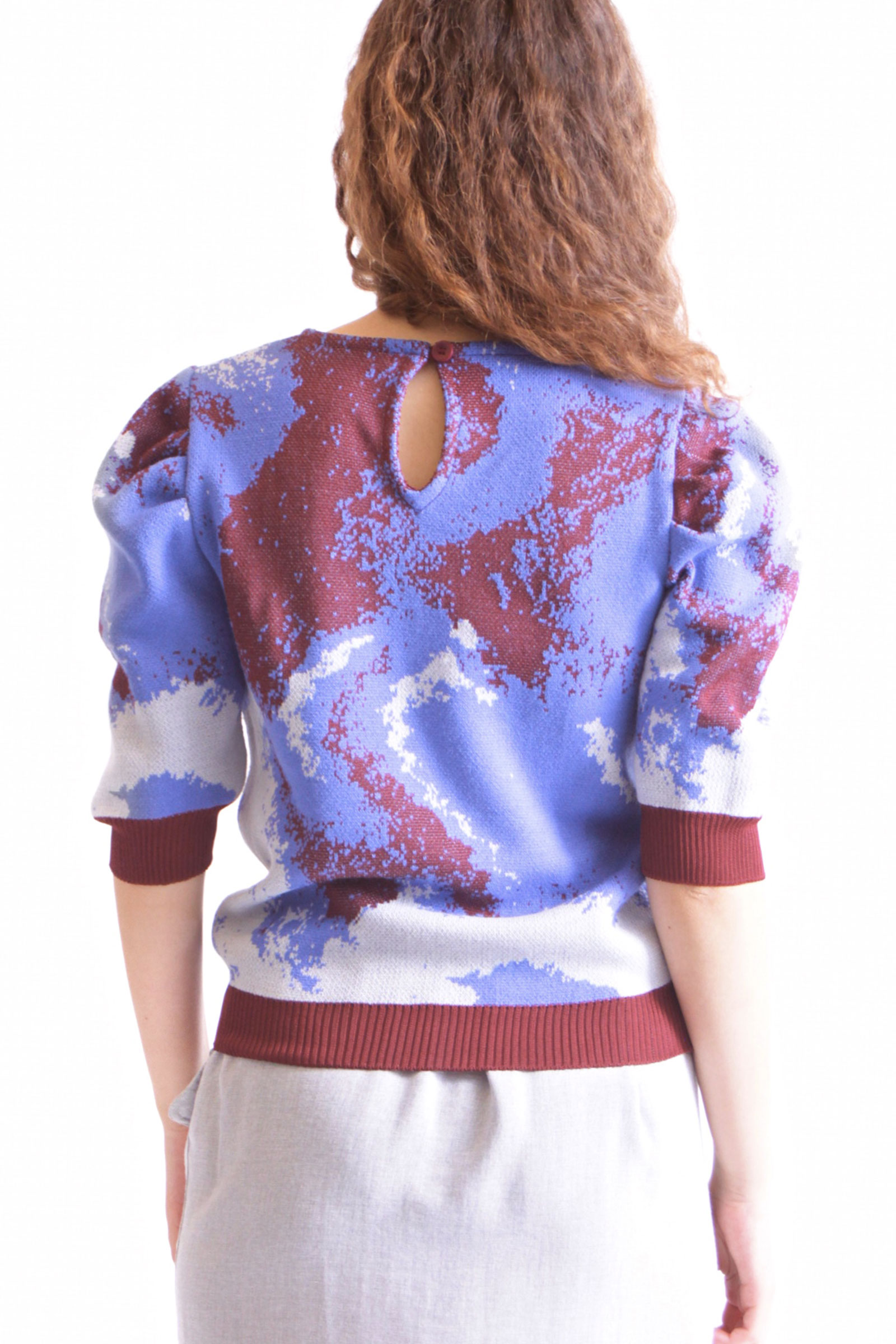 Marble pattern sweater with pleated 3⁄4 sleeves and teardrop opening on the back. La combinaison des couleurs consiste d’ aubergines, gris pearl et bleu violet.