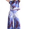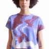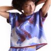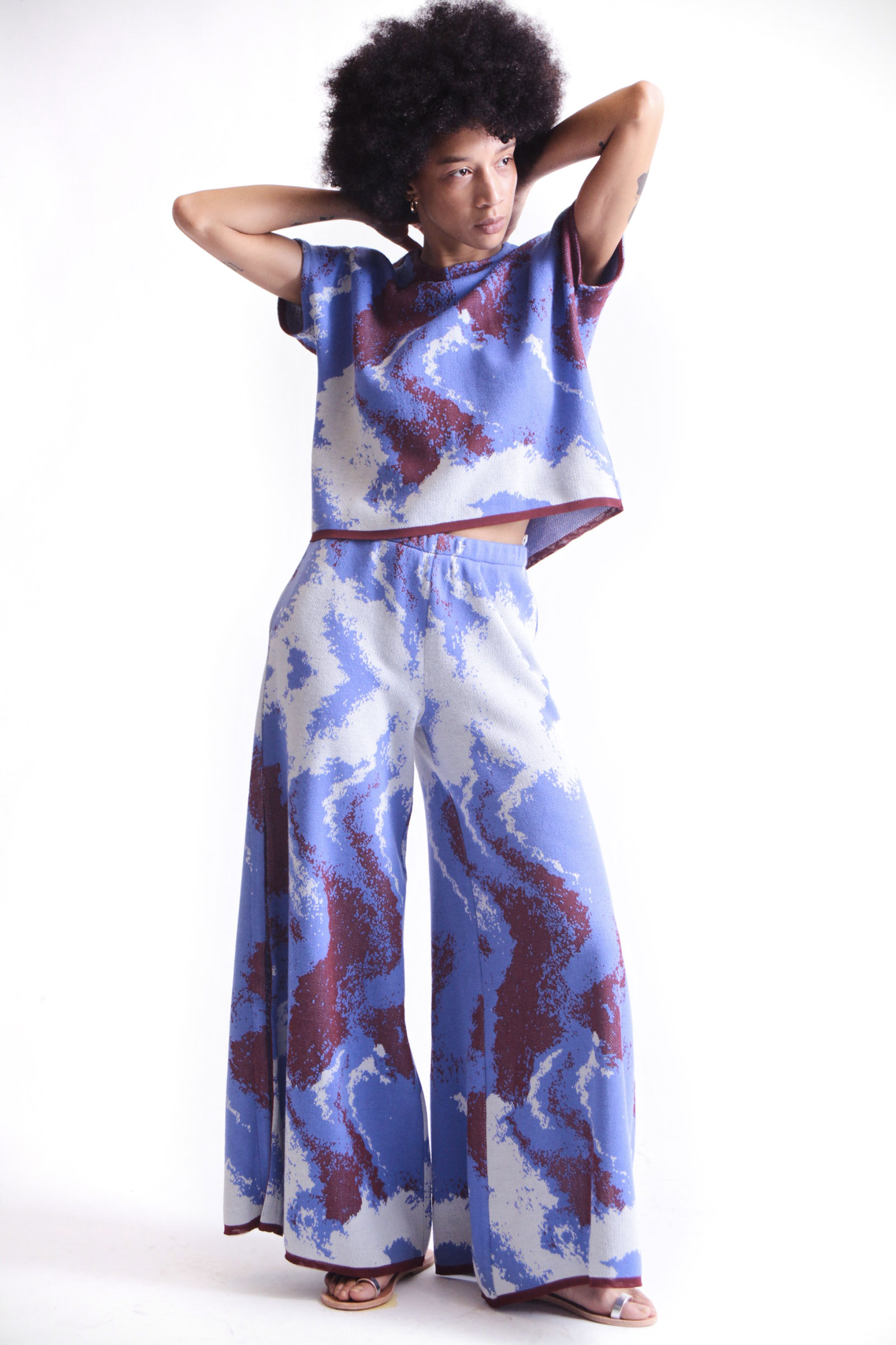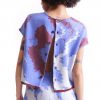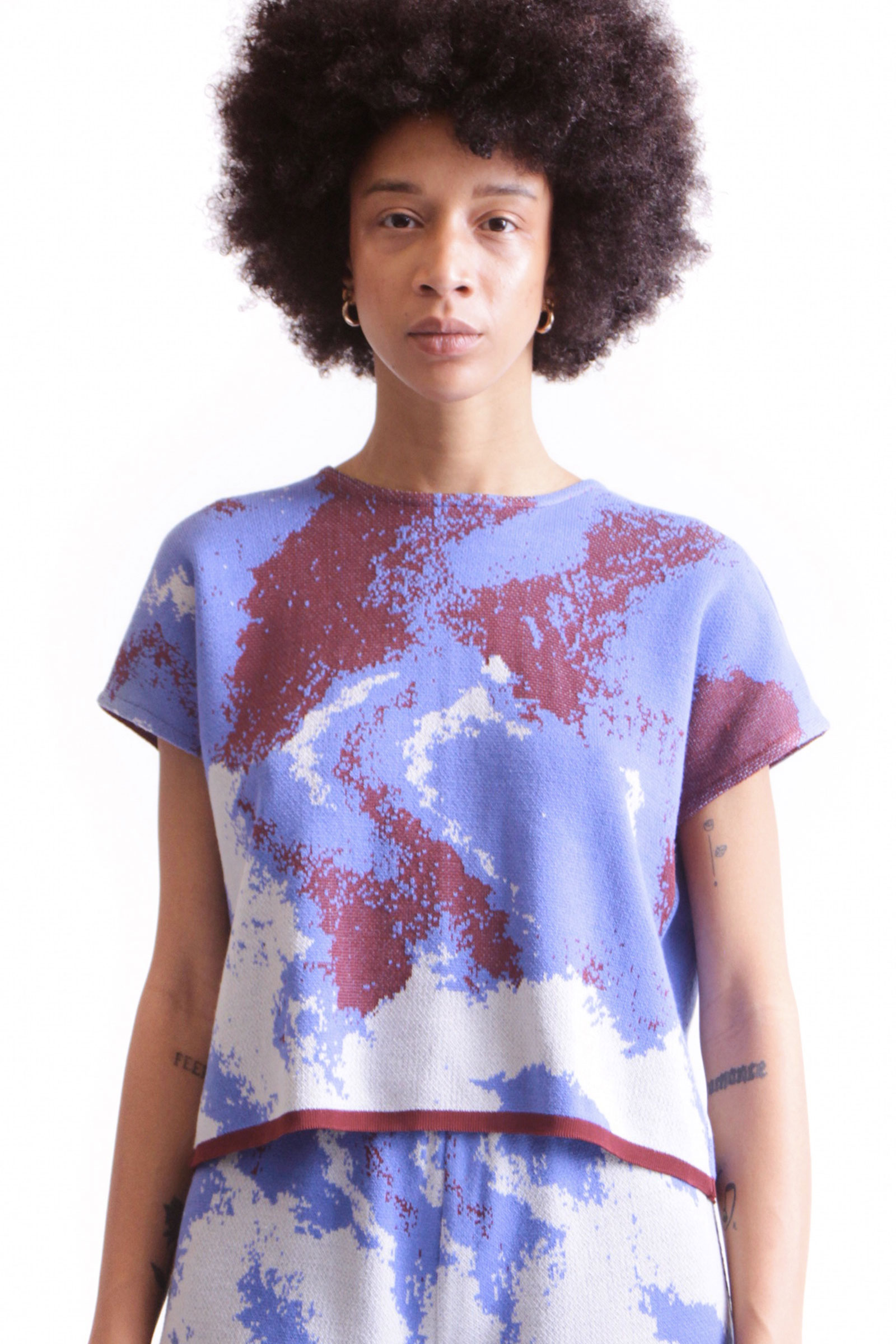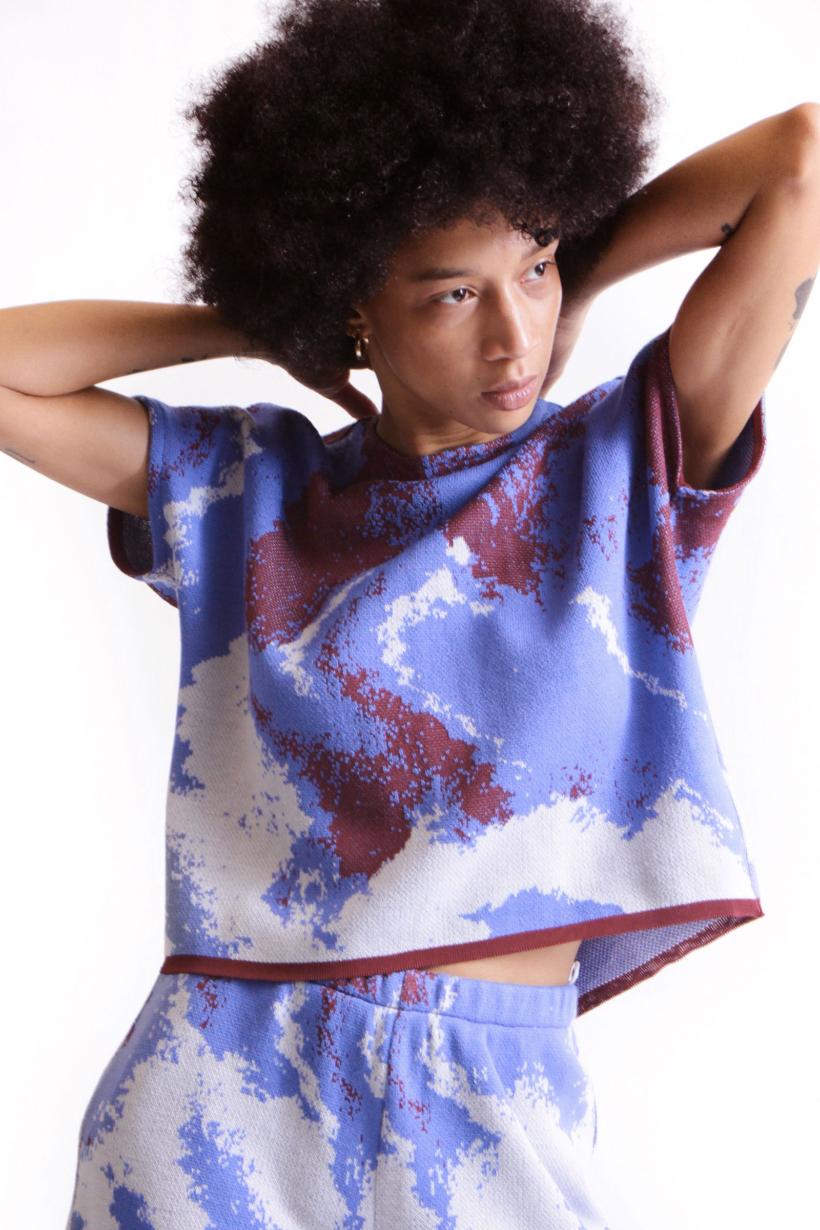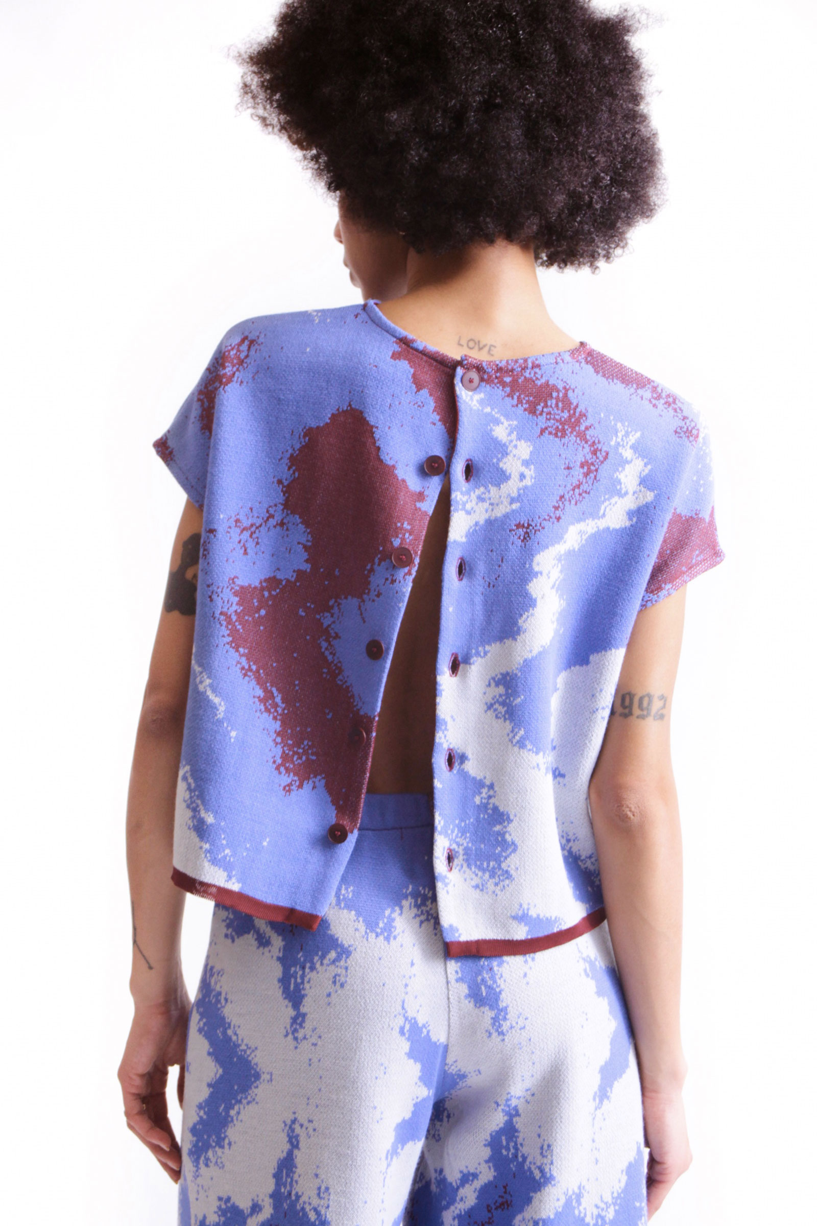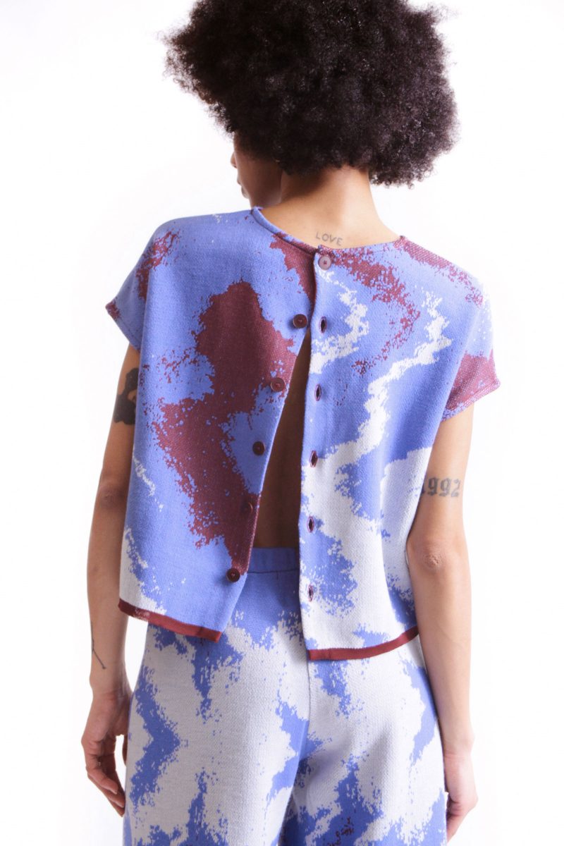 Top court en maille motif marbre, manches chauve souris et dos entièrement boutonné. La combinaison des couleurs consiste d’ aubergines, gris pearl et bleu violet.