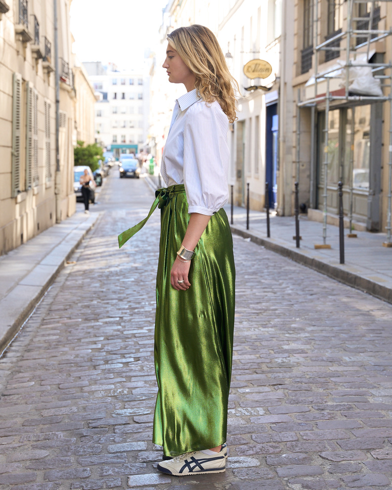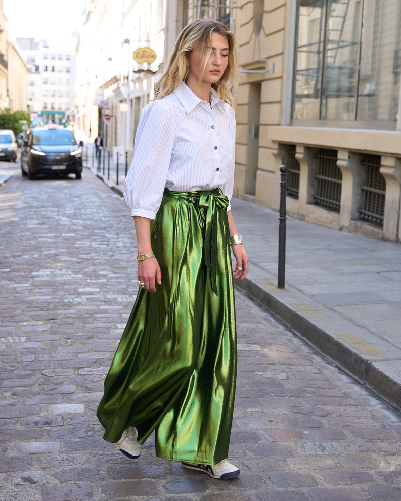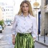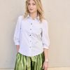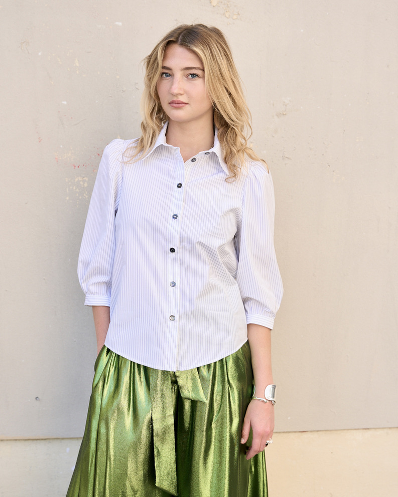 Cotton poplin shirt with fine blue stripes on white, it features puffy sleeves and shell buttons.