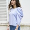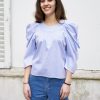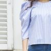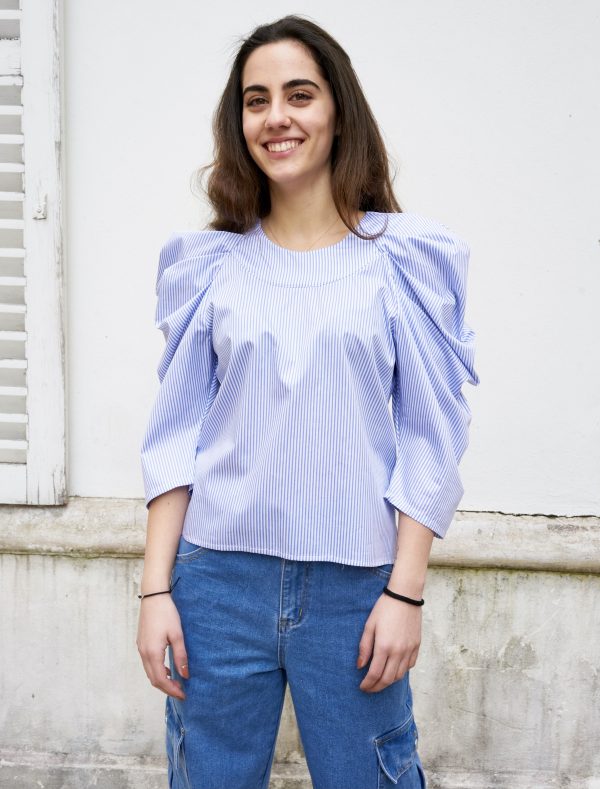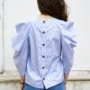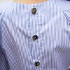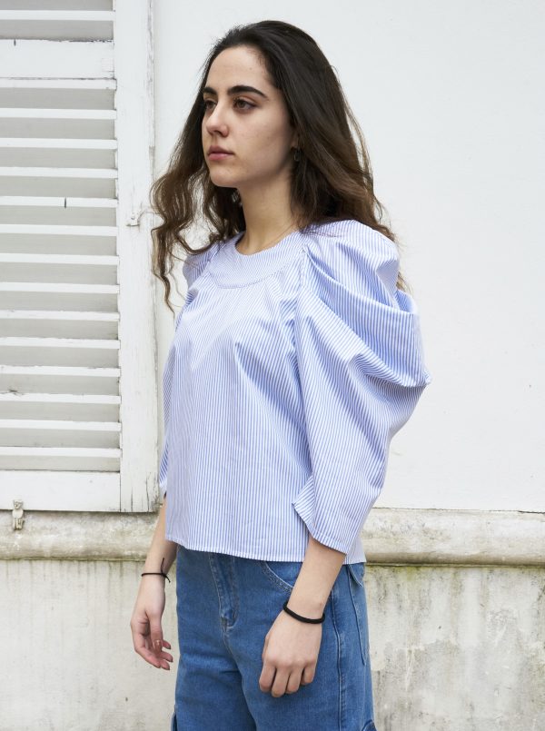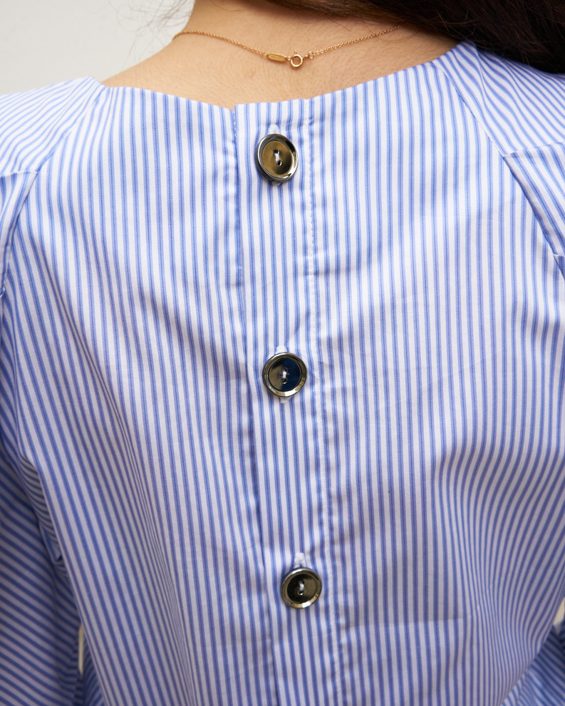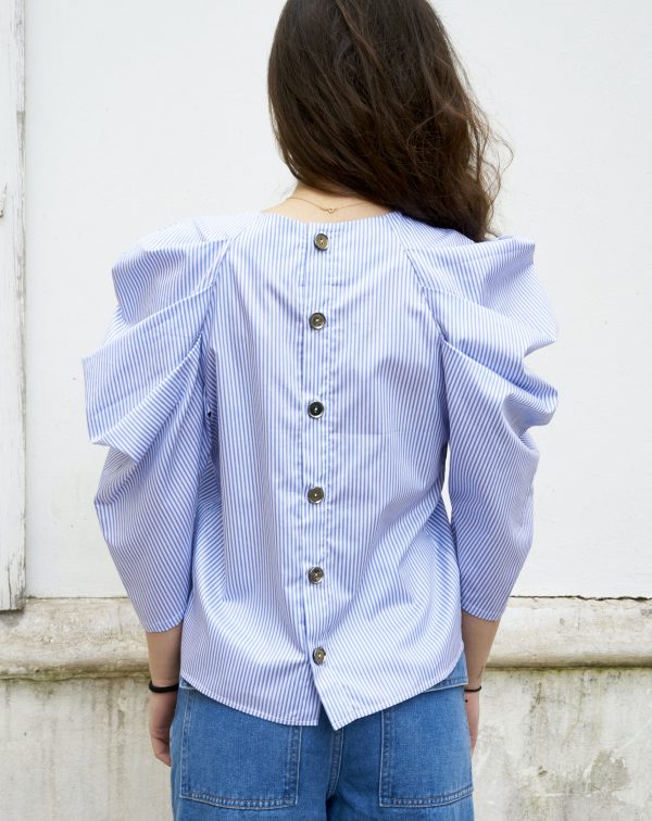 Stripe top with pleated raglan sleeves which create a puffy effect, it buttons all the way down on the back with silver glass buttons