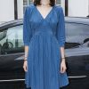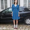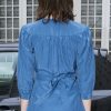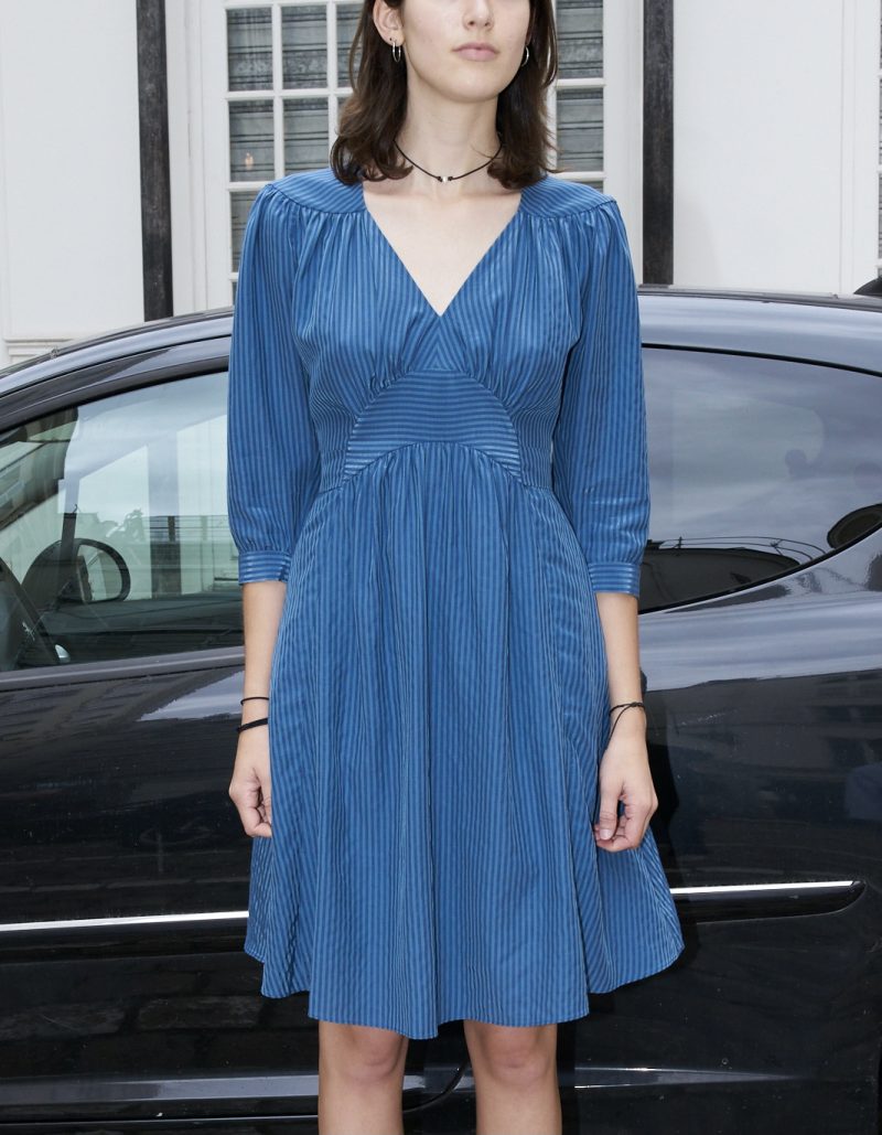 High waist silk stripe dress with structured shoulders and gathered bust, sleeves and skirt, the dress ties in the back with a belt in the same fabric. The skirt is lined with fine tulle.