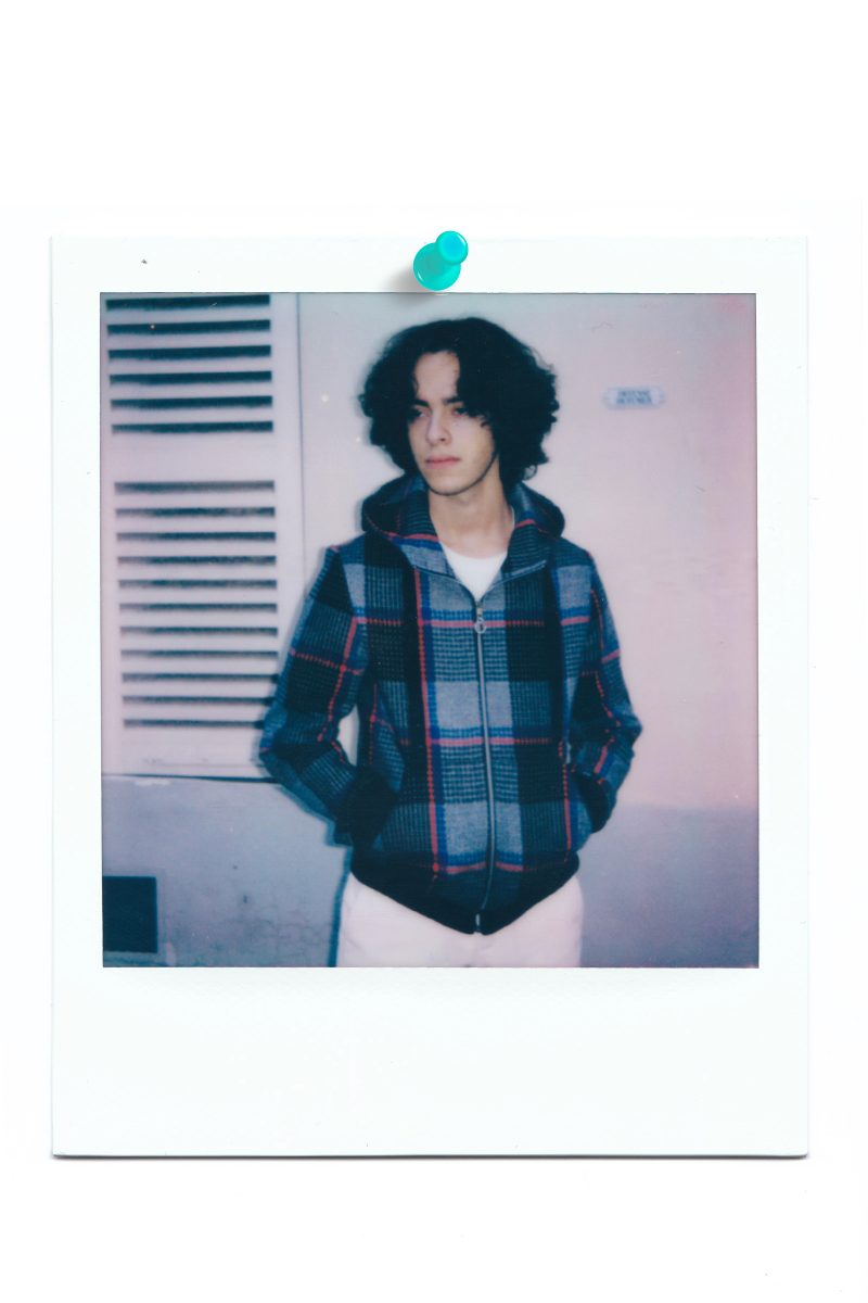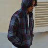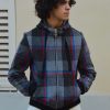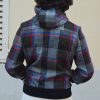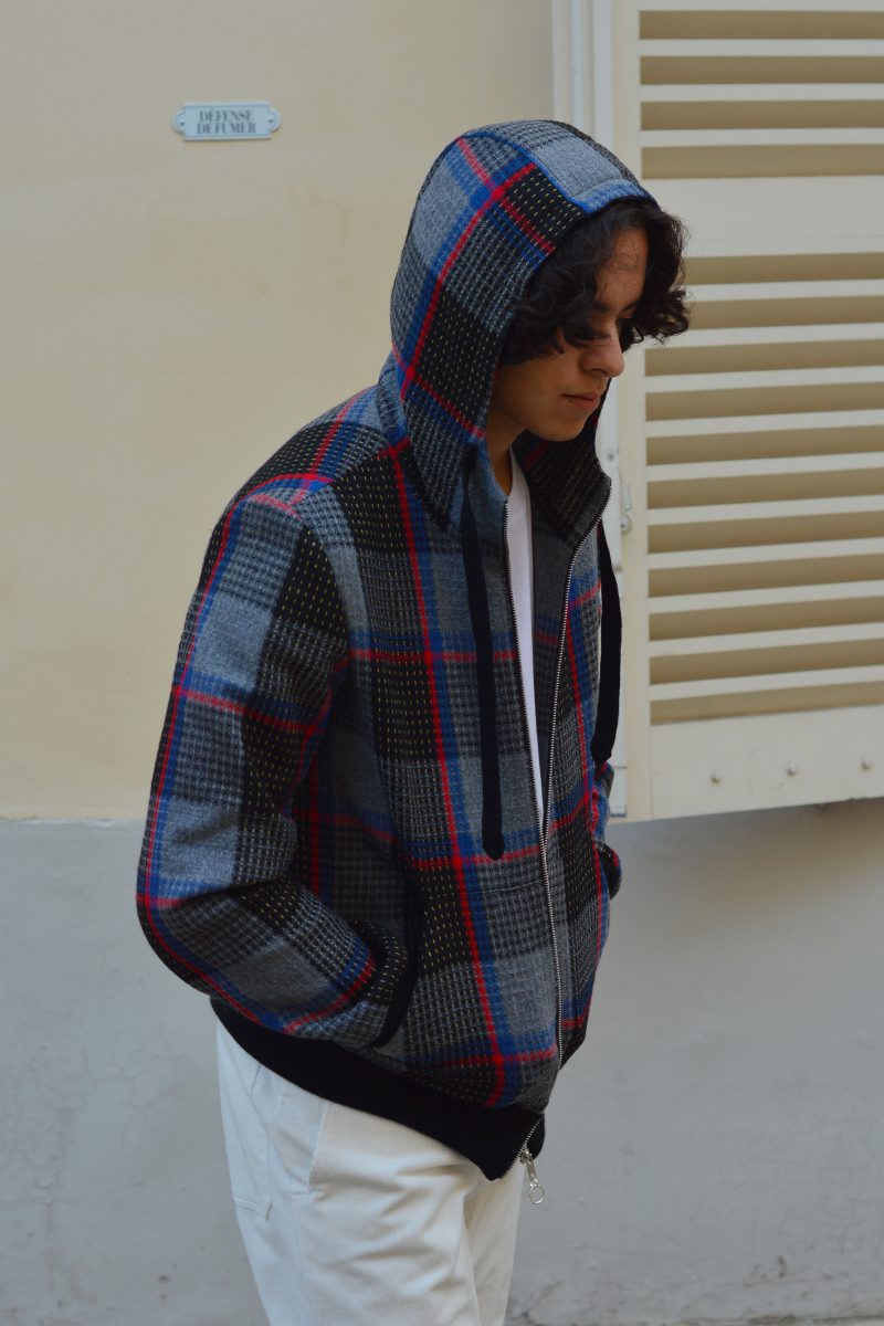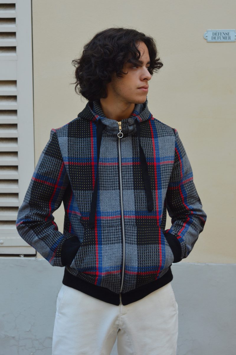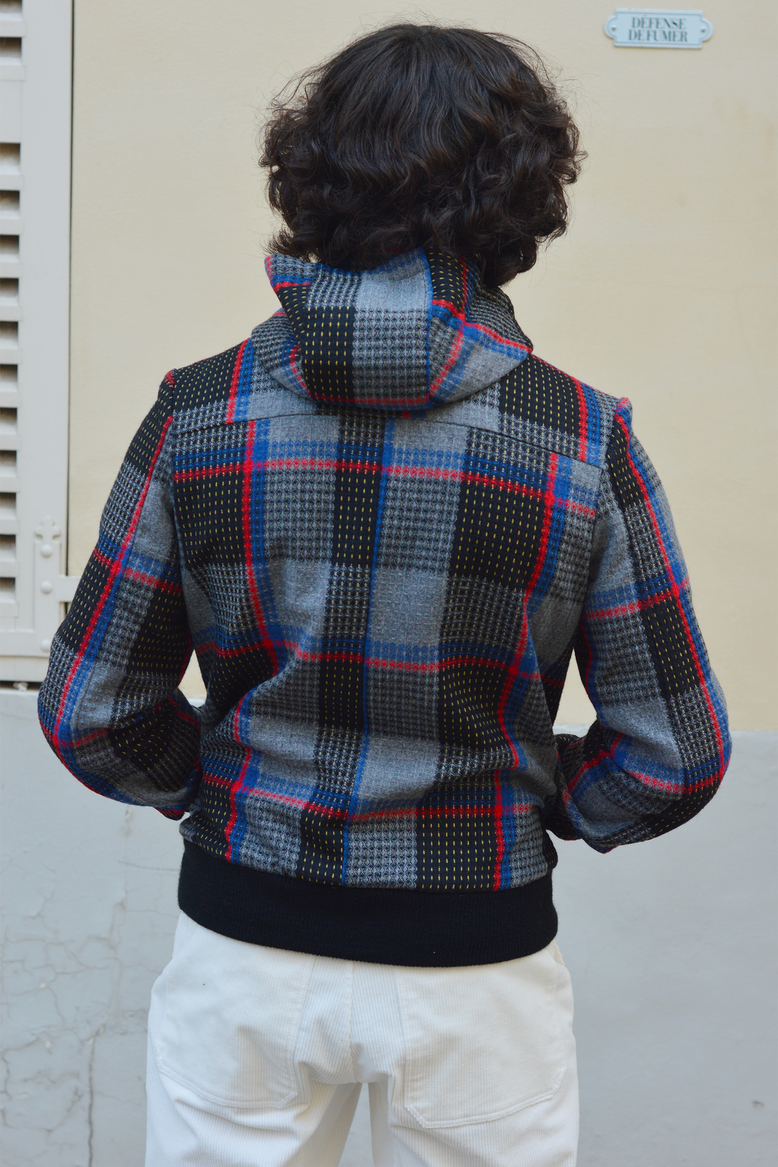 Blouson en laine à carreaux multicolore. Coupe droite, manches longues, la veste possède une capuche avec cordons, une fermeture éclair centrale, 2 poches prise dans la découpe face avant et des bords côtelés. La veste est entièrement doublée de coton métallisé.