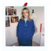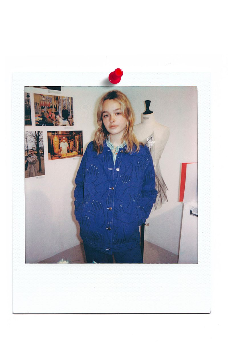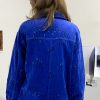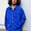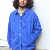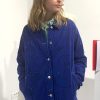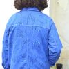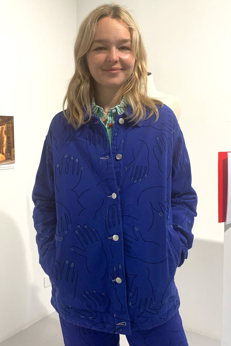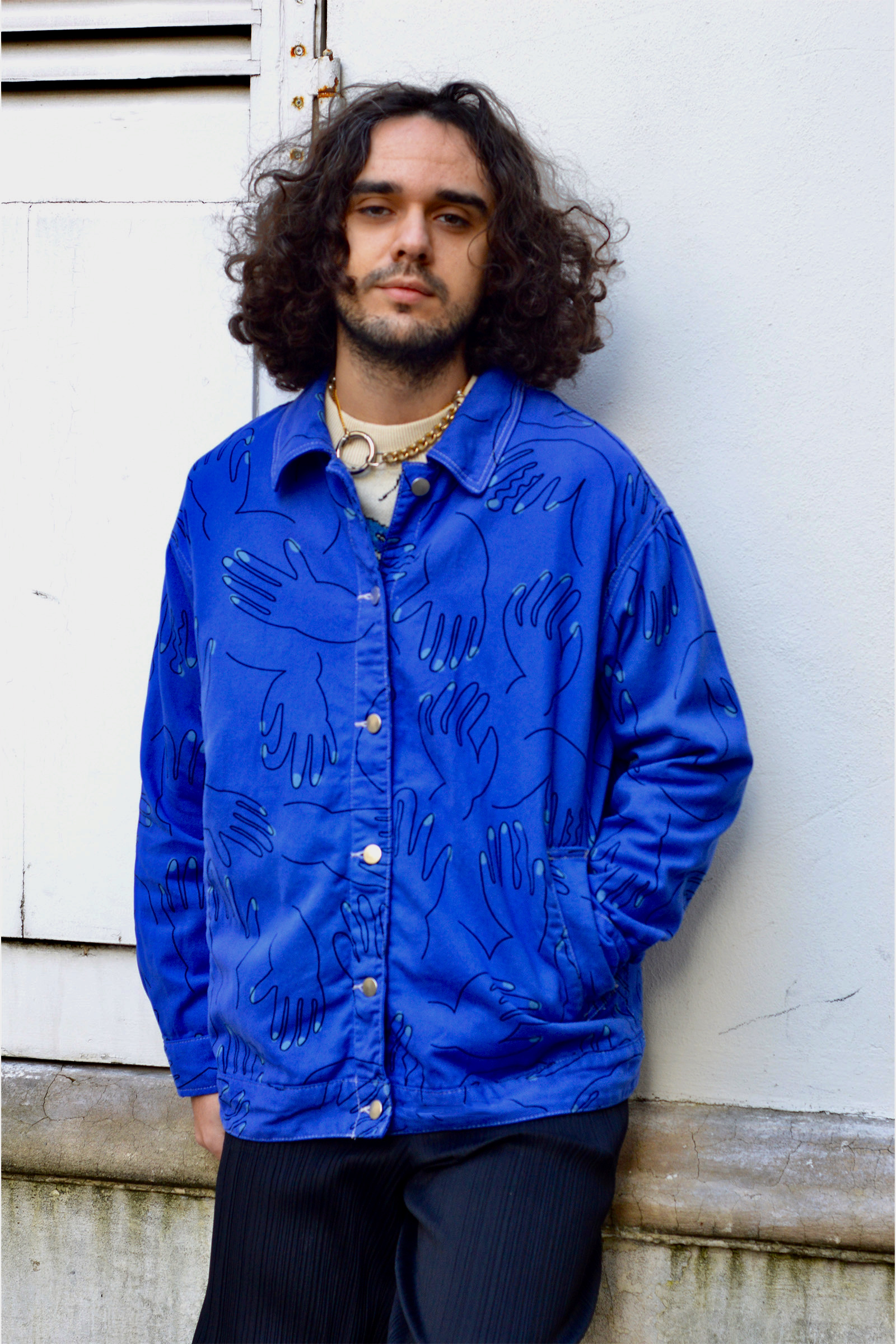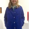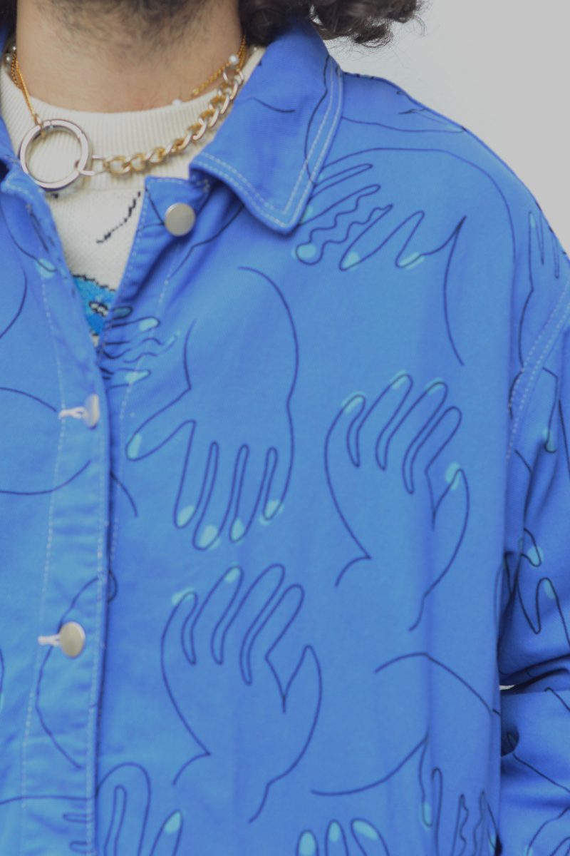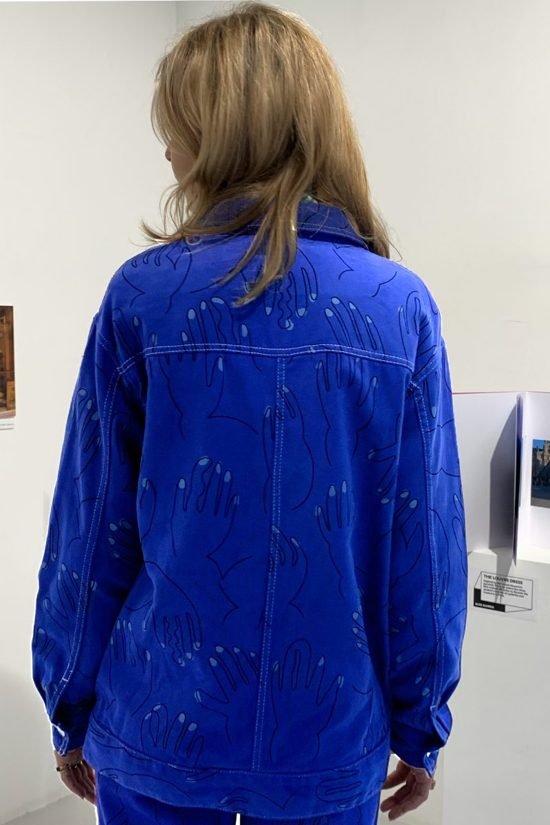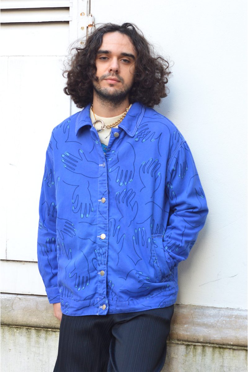 Veste bleu de travail en coton upcyclé a motifs mains. La veste est équipée de poches extérieures et intérieures.
