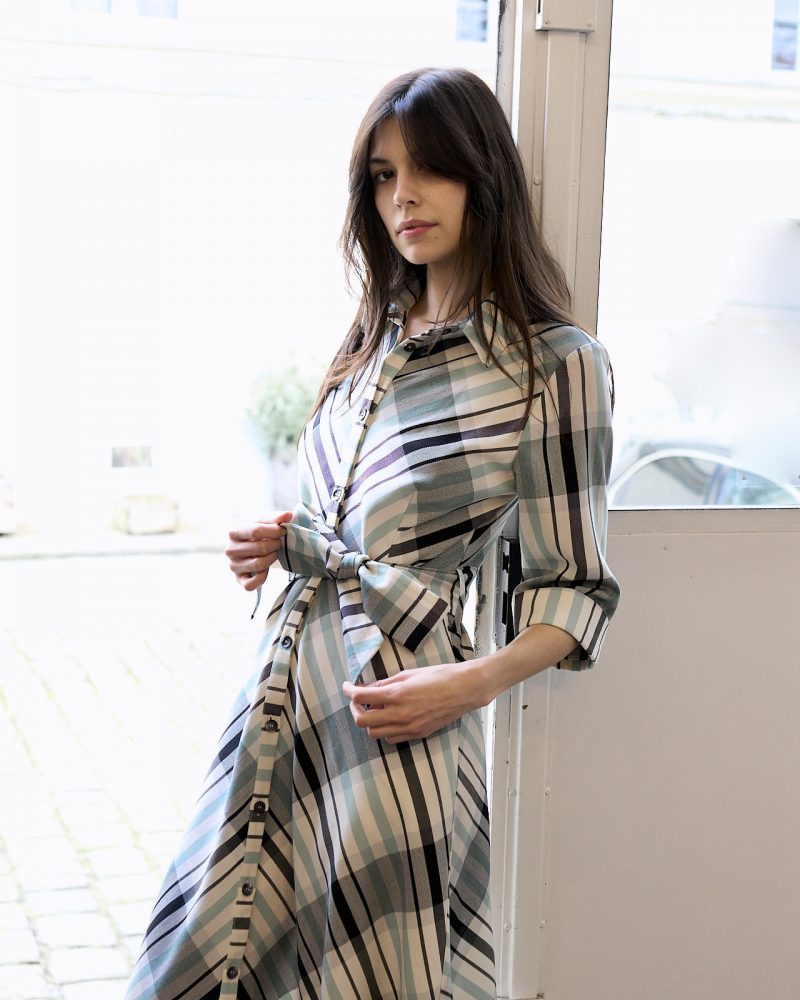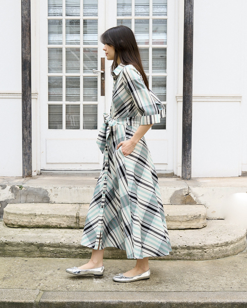 ‘Vita’ bias-cut plaid long shirt dress is an elegant and fluid take on the classic shirtdress silhouette, enhanced by the drape and movement of the bias cut. Crafted from high-quality mercerized cotton, it offers a luxurious sheen, enhanced durability, and a soft yet structured feel. Designed for both style and practicality, it features two side pockets for functionality and side slits for ease of movement, adding a touch of sensuality to its effortless silhouette.