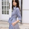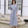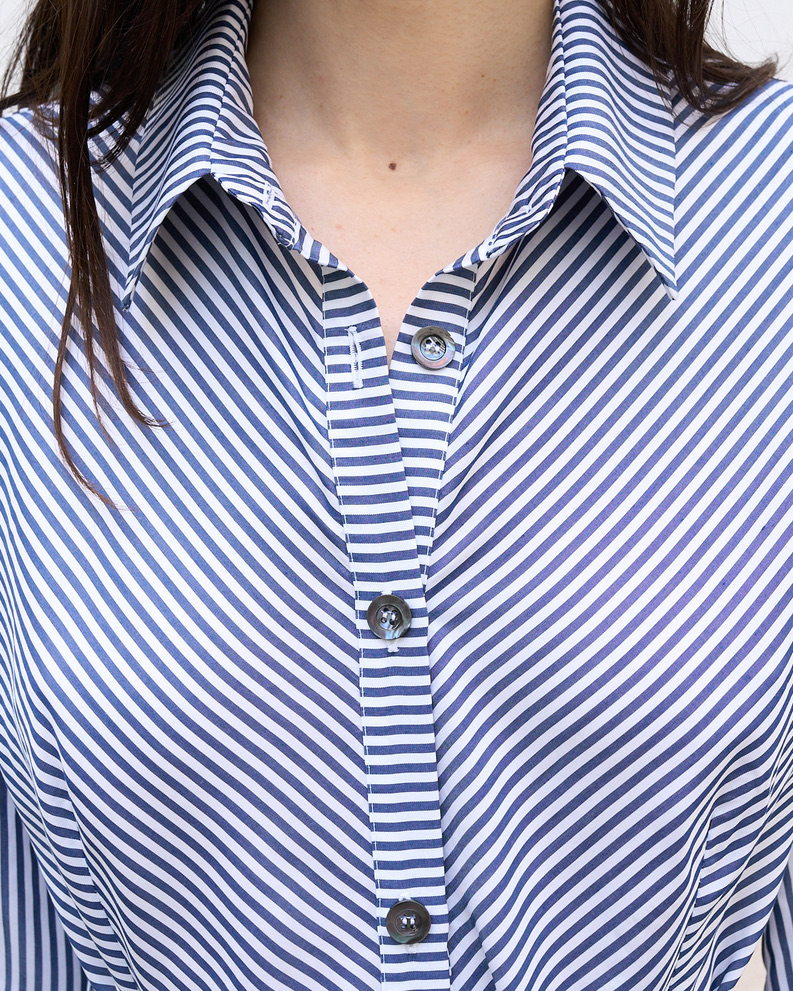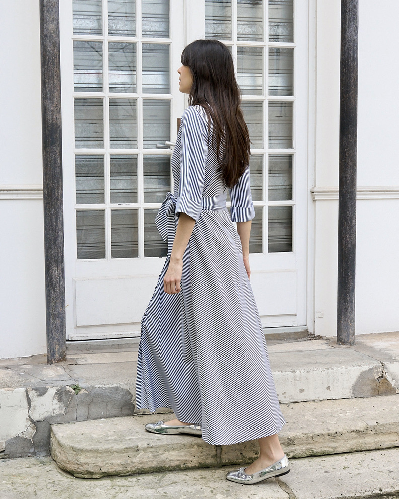‘Vita’ bias-cut stripe long shirt dress is an elegant and fluid take on the classic shirtdress silhouette, enhanced by the drape and movement of the bias cut. Crafted from high-quality mercerized cotton, it offers a luxurious sheen, enhanced durability, and a soft yet structured feel. Designed for both style and practicality, it features two side pockets for functionality and side slits for ease of movement, adding a touch of sensuality to its effortless silhouette.