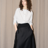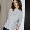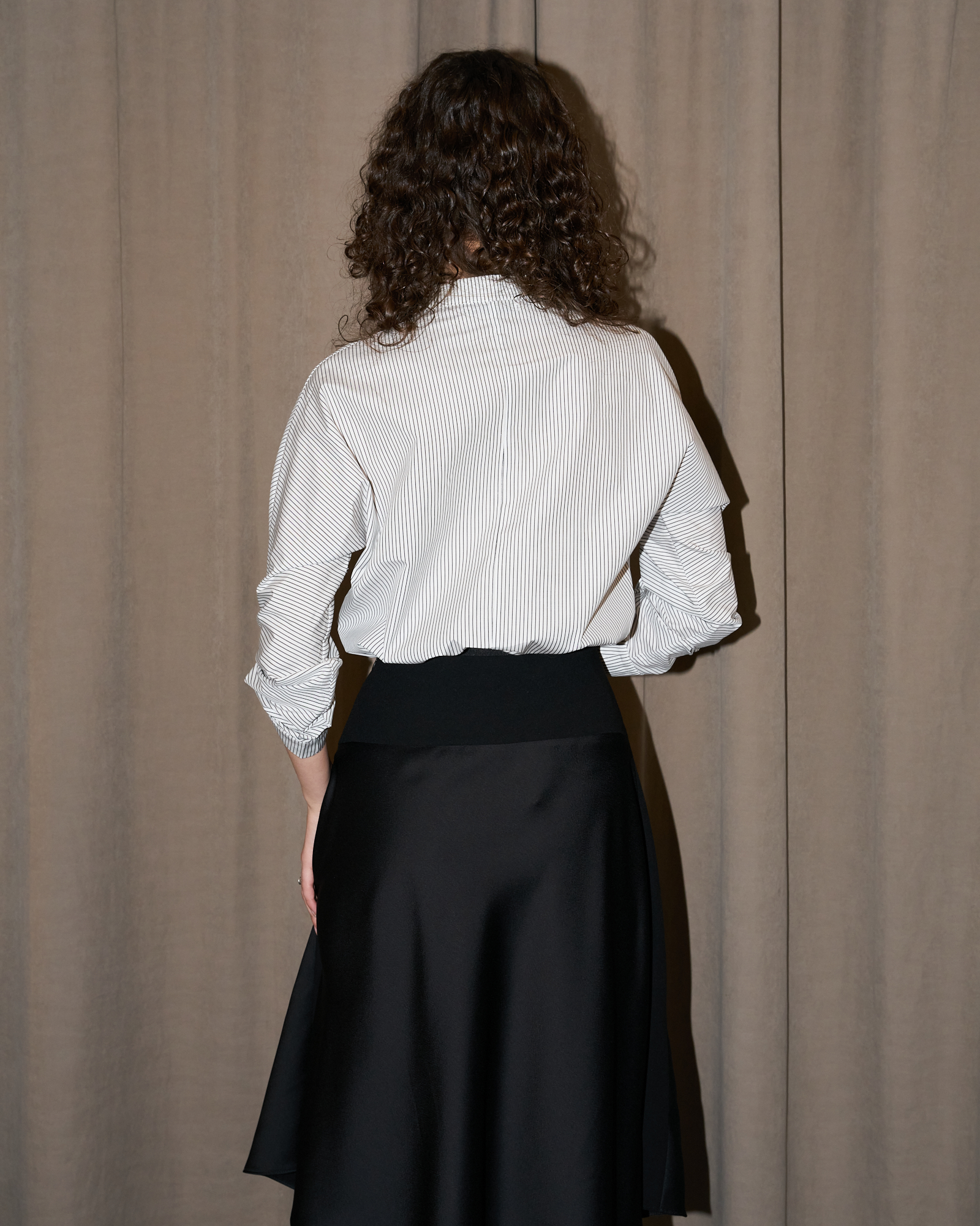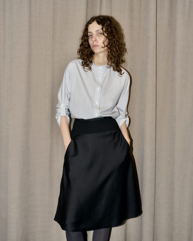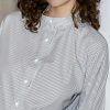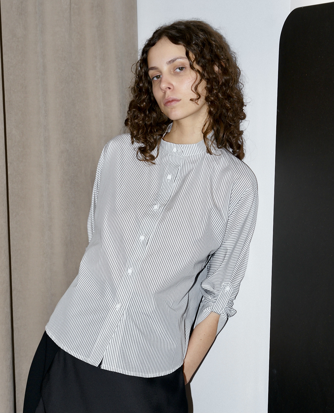 Luxury poplin pin stripe shirt with mandarin collar and length adjustable sleeves.