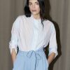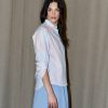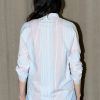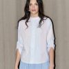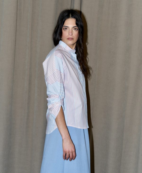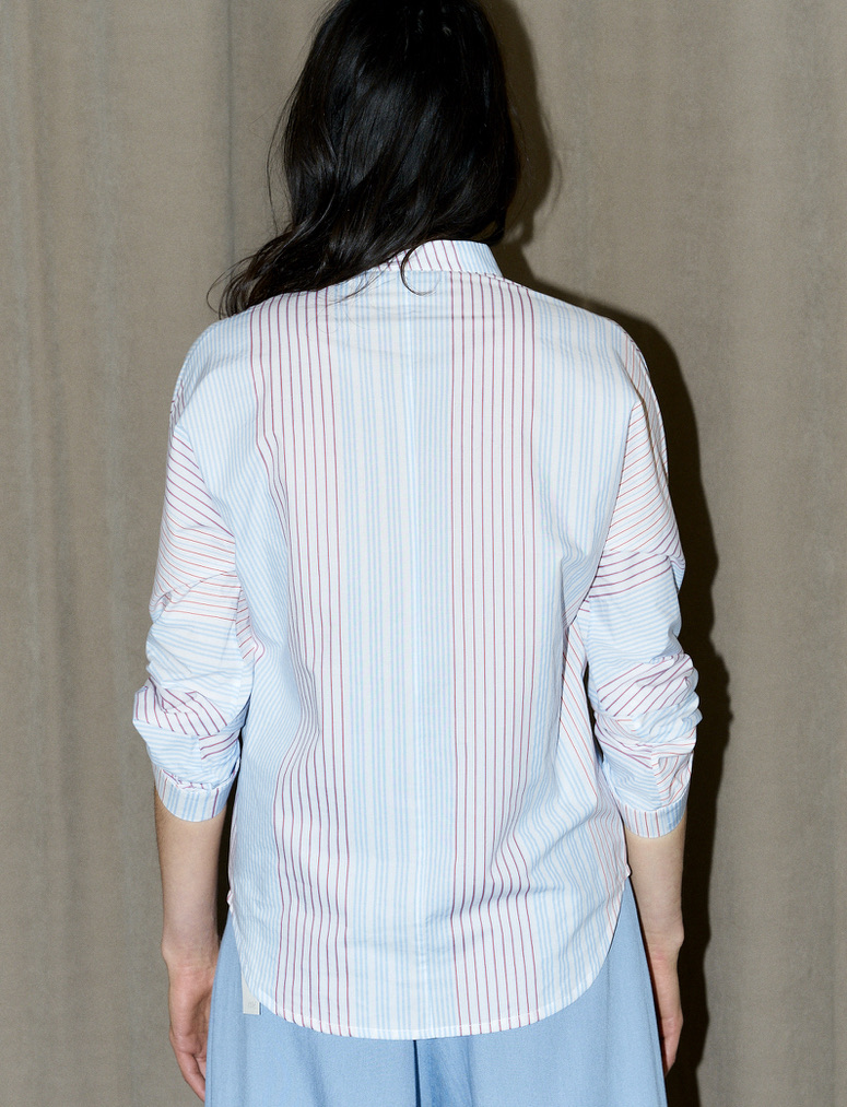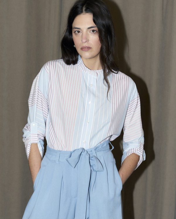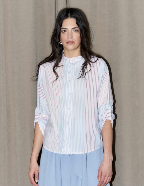 Luxury poplin pin stripe shirt with mandarin collar and length adjustable sleeves.