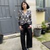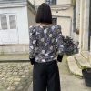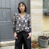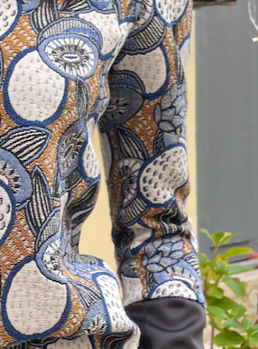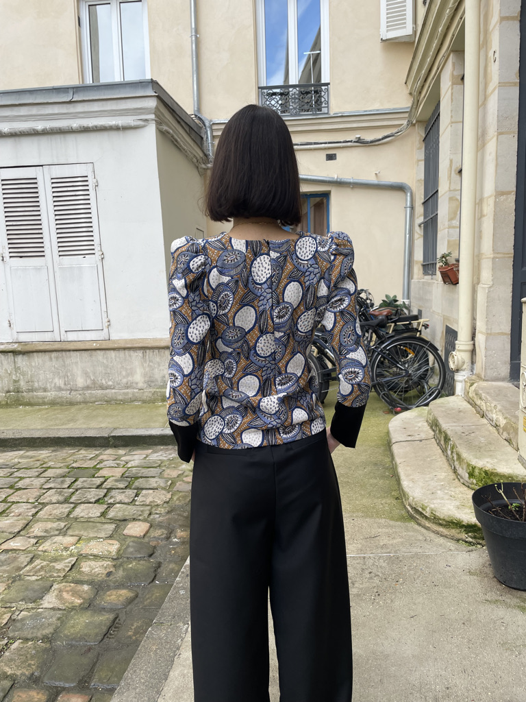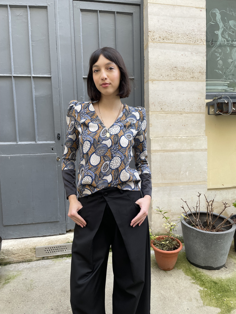 A statement piece crafted from a richly textured woven jacquard featuring a delicate fruit motif. The silhouette is defined by sculptural puffy shoulders that add a touch of drama, while the sleek black satin cuffs introduce a refined contrast. Elegant, playful, and versatile, this top blends artisanal fabric work with modern femininity.