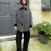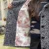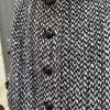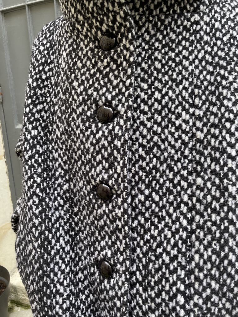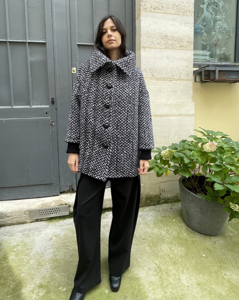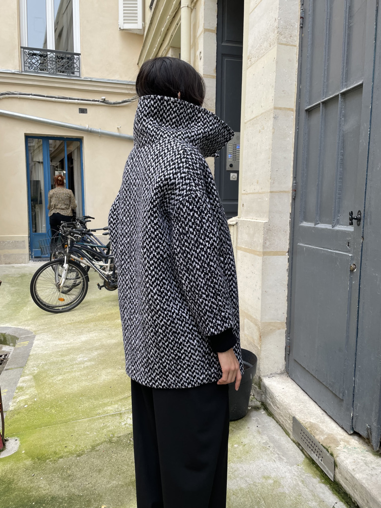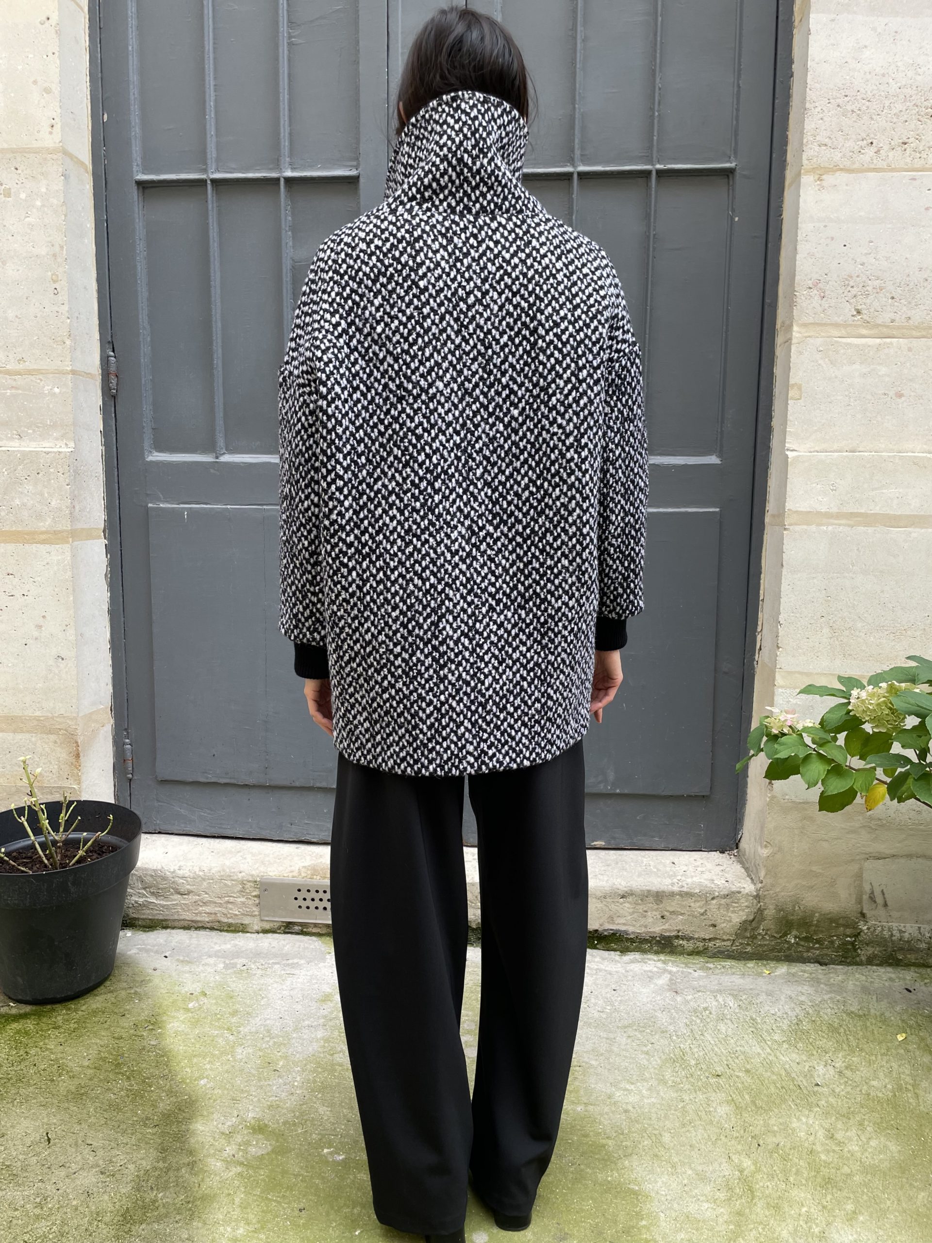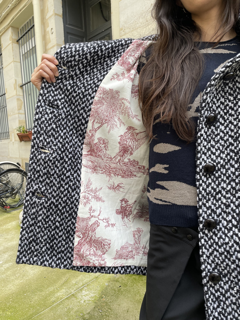 This short oversized coat evokes the sculptural elegance of the 1920s with its rounded, cocoon-like silhouette and drop shoulders. Crafted from a luxurious black-and-white tweed, it balances volume and structure with effortless sophistication. The high standing collar adds a dramatic, vintage allure, while the ribbed finishings at the sleeves introduce a modern, sporty twist. Inside, a Toile de Jouy lining—reveals an unexpected touch of refinement, turning the interior into a secret garden of storytelling and style.