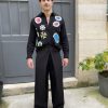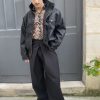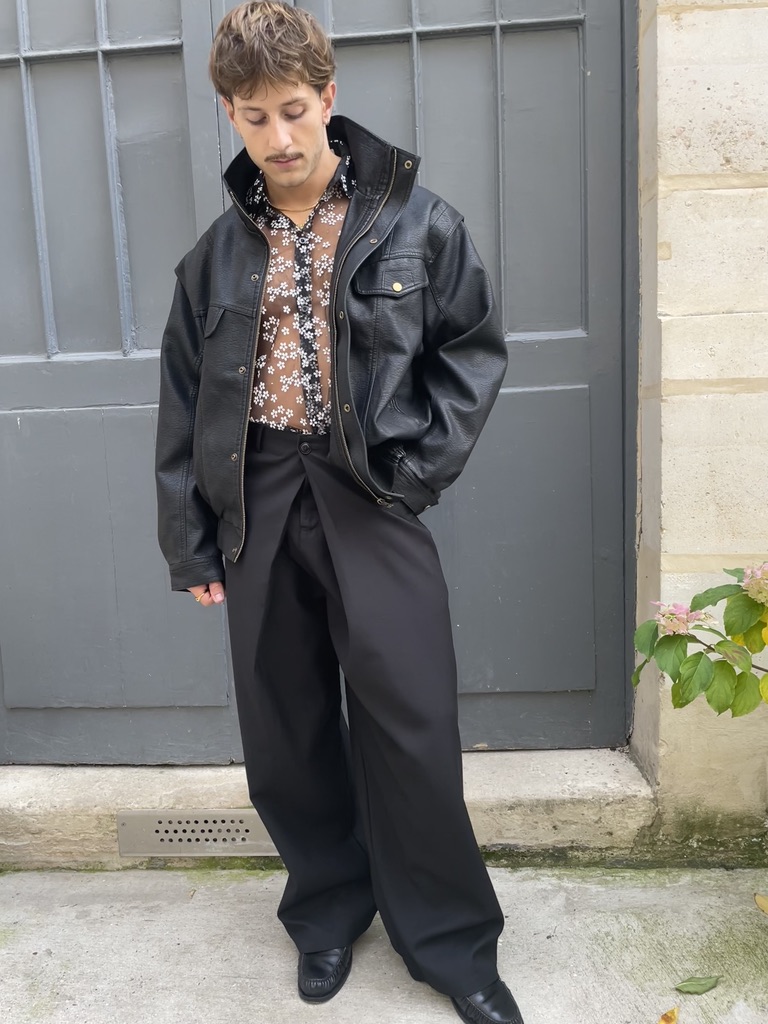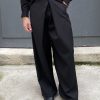 These fluid, wide-leg trousers feature a distinctive asymmetrical front closure that unfolds into a large sculptural pleat, creating a subtle play of volume and movement. Crafted in a matte black wool-blend fabric, they combine tailored precision with relaxed ease. The slightly low waistline is finished with a discreet back elasticated band for added comfort and a perfect fit. A refined piece that merges architectural structure with effortless wearability.