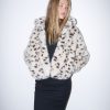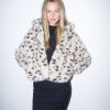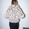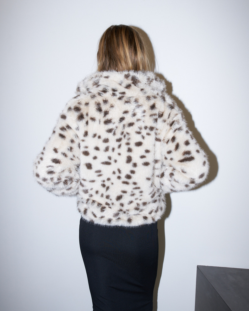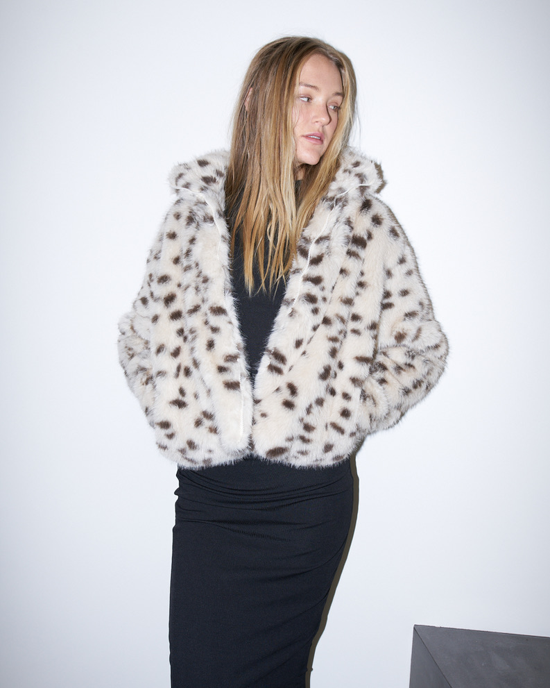 High neck crop soft faux fur jacket with pockets and satin lining.