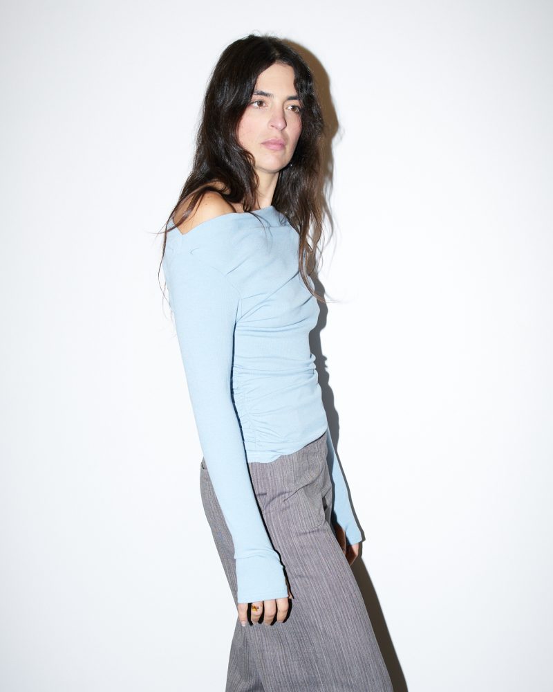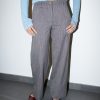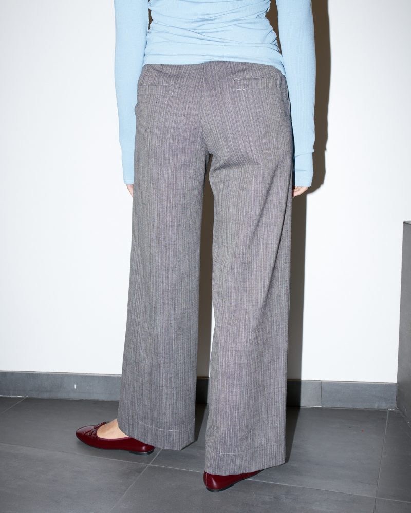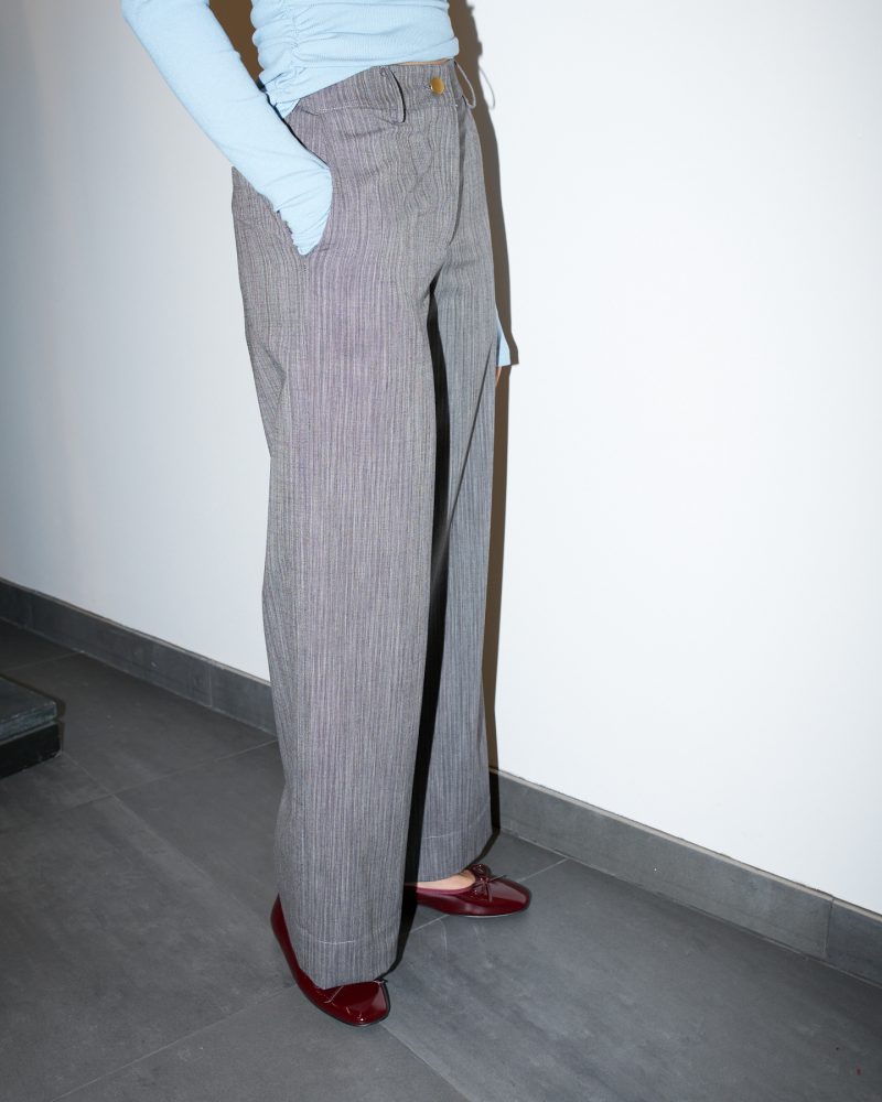 Stylish sailor leg pants with two side pockets and two slit back pockets.This style is cut from luxurious fine wool fabric.